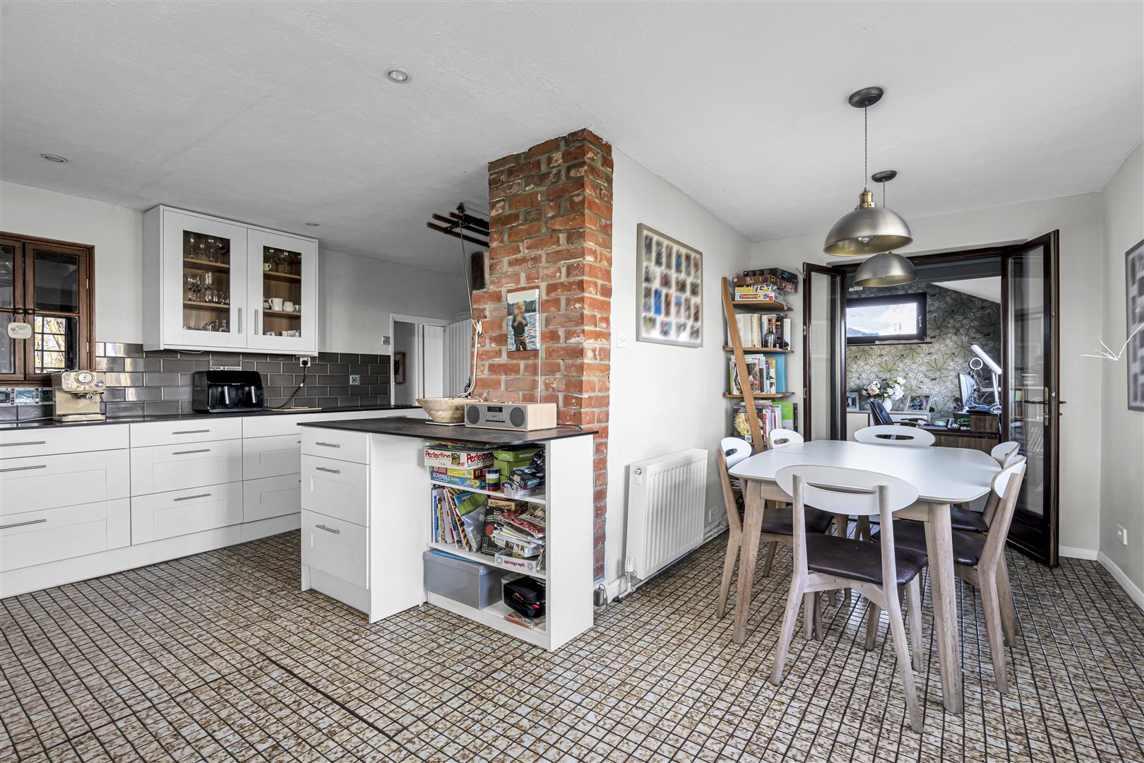 To the rear, the kitchen/dining room forms the heart of the home, offering a well-planned layout that blends modern practicality with rustic touches. A full run of fitted cabinetry provides excellent storage, complemented by tiled splashbacks and a characterful brick-built chimney breast, while an AGA adds both charm and warmth, creating a timeless focal point for the room. The dining area enjoys views over the garden with access directly outside, ideal for summer entertaining, and a walk-in larder adds further day-to-day convenience. Just off the kitchen is a dedicated study with countryside views, perfectly suited to home working or creative use.