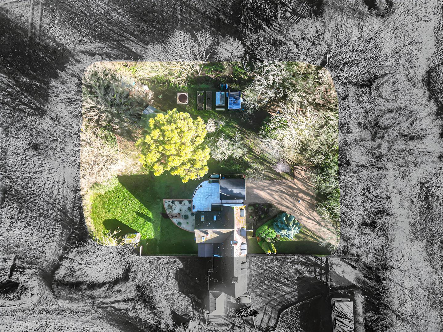To one side sits a detached summerhouse/studio, positioned to take full advantage of the surrounding greenery, while the remainder of the plot offers open grassed areas, four timber sheds, and pockets of natural shade beneath the trees creating a versatile and wonderfully tranquil outdoor setting.