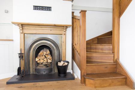 Lounge - 4.57m max into recess x 3.71m (15'0" max into rece - Composite double-glazed front entrance door. UPVC double-glazed window with plantation shutters to front aspect. Open fire to tiled hearth and timber mantle piece. Understairs storage cupboard. Metre cupboard. Exposed timber ceiling beams. Oak floor. Opening through to dining room.