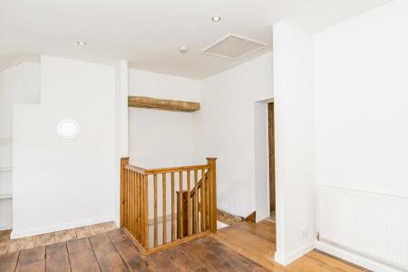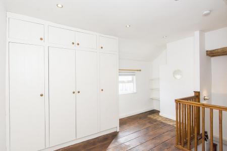Bedroom One - 4.17m to chimney breast x 3.68m max (13'8" to chim - UPVC double-glazed window to front. Loft access hatch. Fitted wardrobes. Exposed timber floorboards. Radiator.
