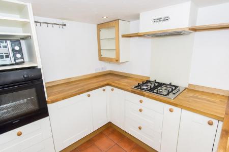 Kitchen - 2.69m x 2.26m (8'10" x 7'5" ) - UPVC double-glazed window to rear. Wall and floor mounted units with timber work tops. Ceramic one and a half bowl sink with mixer tap and drainer inset. Electric oven. Gas hob. Integrated dishwasher. Integrated fridge. Tiled splash backs. Tiled flooring.