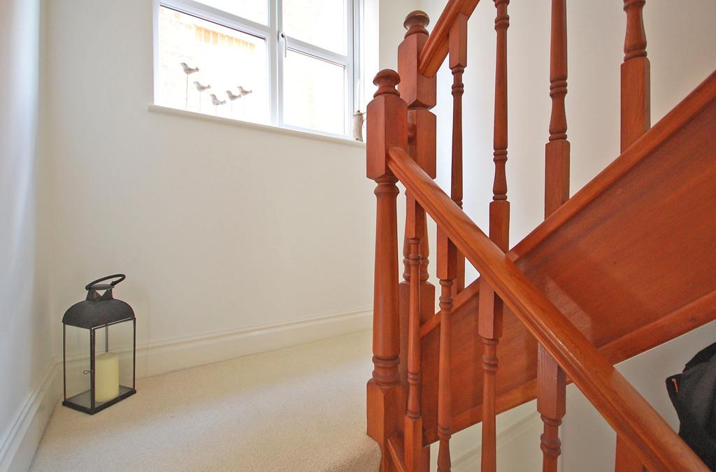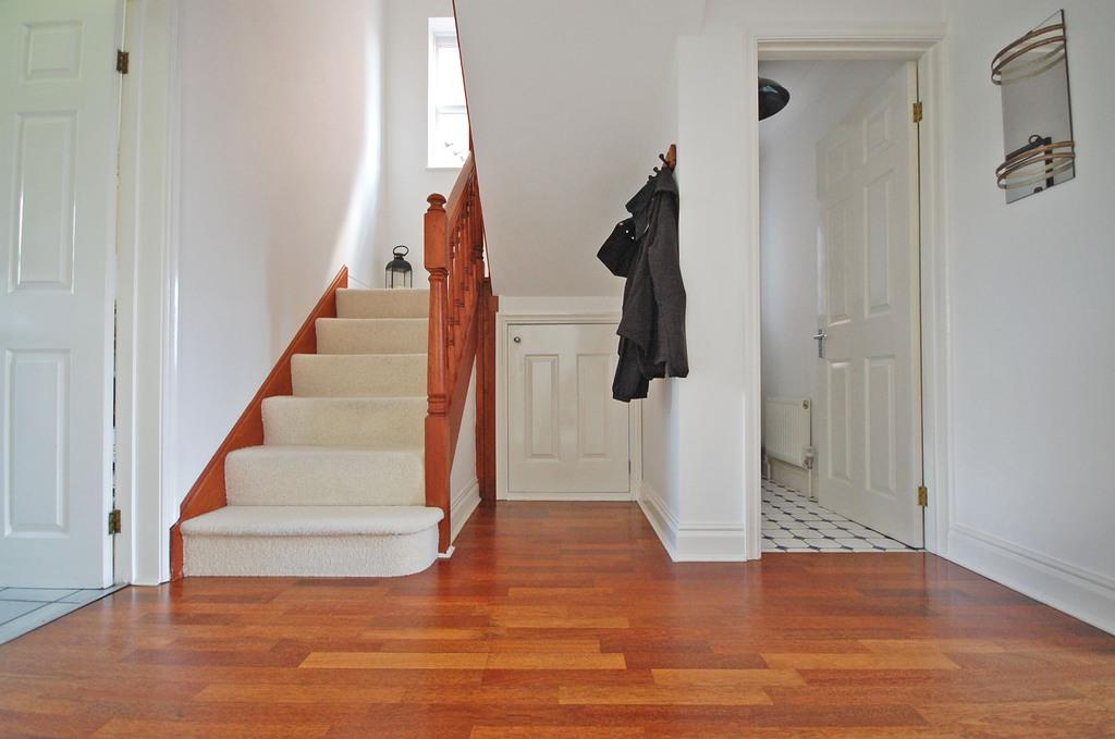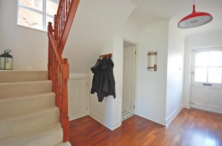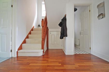 Part-glazed entrance door, stairs to first floor with understairs storage cupboard, radiator, wooden flooring and smooth coved ceiling.
