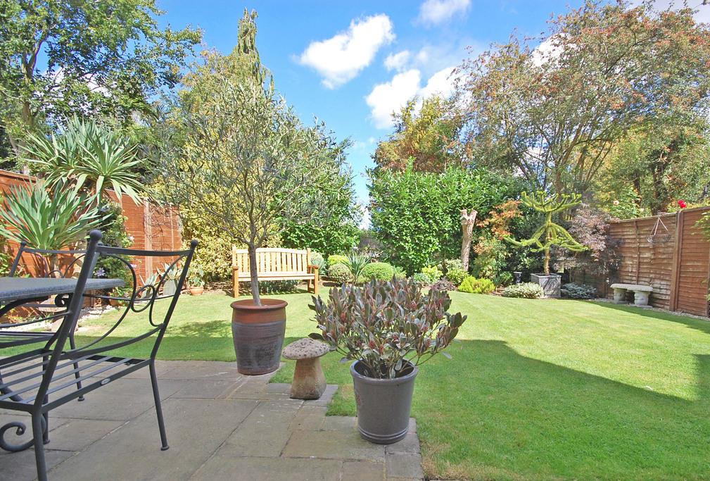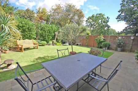 Unoverlooked garden, enclosed by fencing and commencing with patio area, remainder mainly laid to lawn with a series of mature shrubs and trees to rear, decorative stone borders and gated side access.