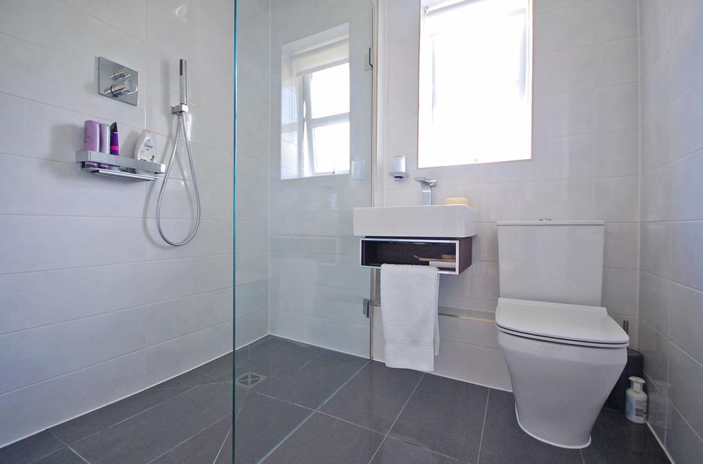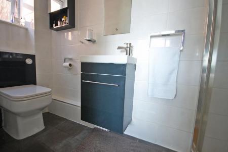 Opaque double glazed window to rear aspect, fully tiled with double shower and dual shower functions, low level WC, inset wash hand basin, extractor fan, heated towel rail, tiled flooring and smooth ceiling with sunken spotlights.