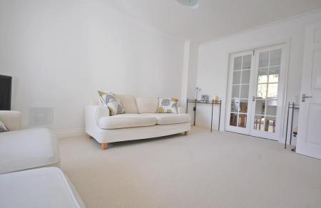 Radiator, wooden flooring and smooth coved ceiling. French doors to rear garden.
