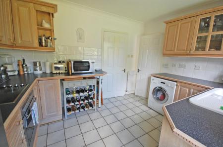 Double glazed window to rear aspect, a series of matching base and wall units, one and a half ceramic sink with central mixer tap and drainer, built-in oven with electric hob and extractor hood over, integrated dishwasher and washing machine, space for fridge/freezer, radiator, tiled flooring and smooth coved ceiling.