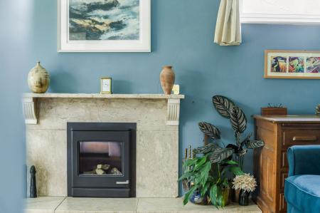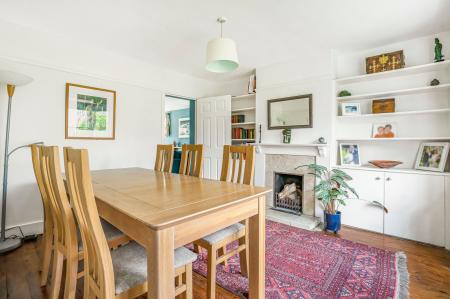 The property is accessed via the gravel driveway or path to the front door, framed by a storm porch with wooden surround and picket fencing. To the left of the entrance hall is the family room/office with pine flooring, stunning bay sash window, built in cupboard and bookcase. To the right is a further reception room, currently used as a dining room, also with a bay window, built in storage and book shelves. A feature open fireplace with tiled hearth and wooden surround provides a focal point.