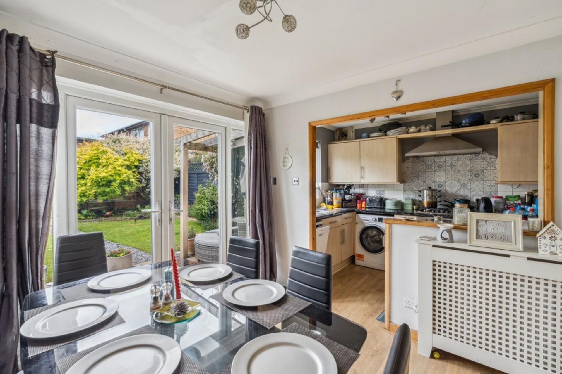 The dining room has a rear aspect with double patio doors overlooking the pretty rear garden. Walls have been removed to give an open feel to the kitchen which is well designed with a range of wall and floor mounted units, integrated five ring gas hob and double oven, a slimline dishwasher and space for fridge freezer and washing machine.