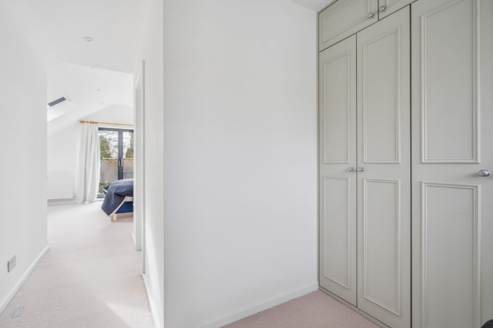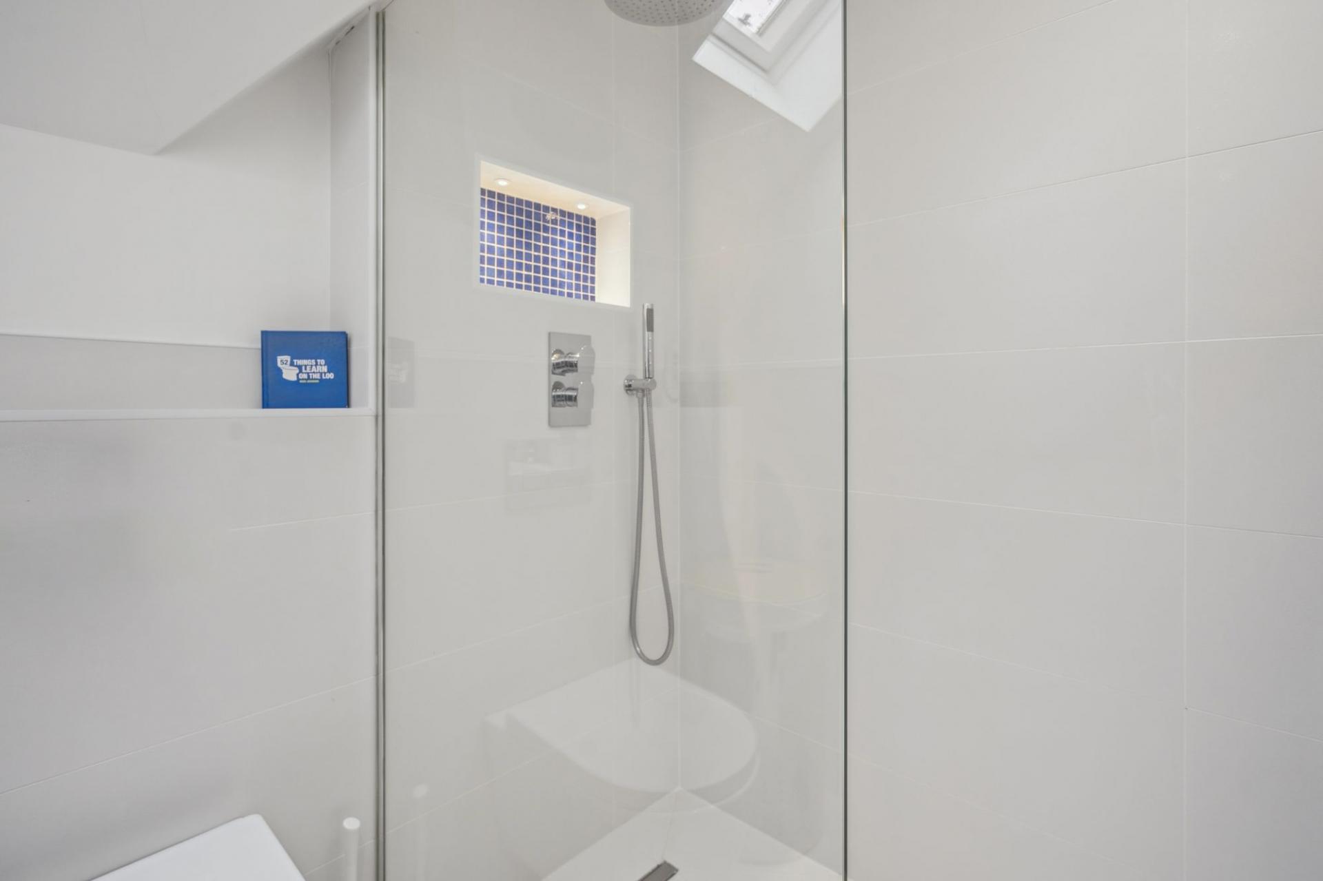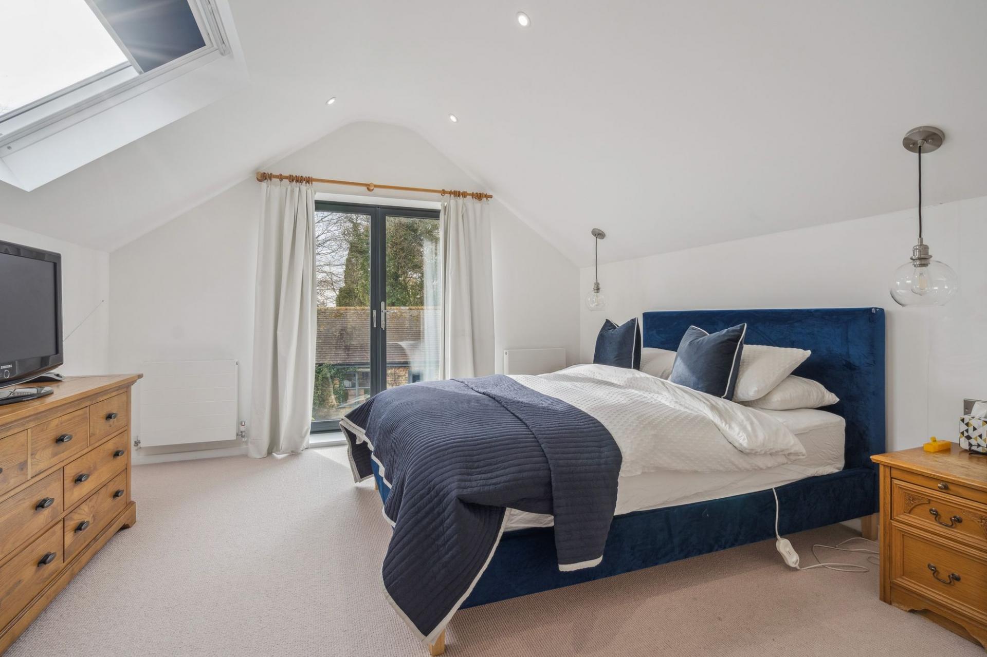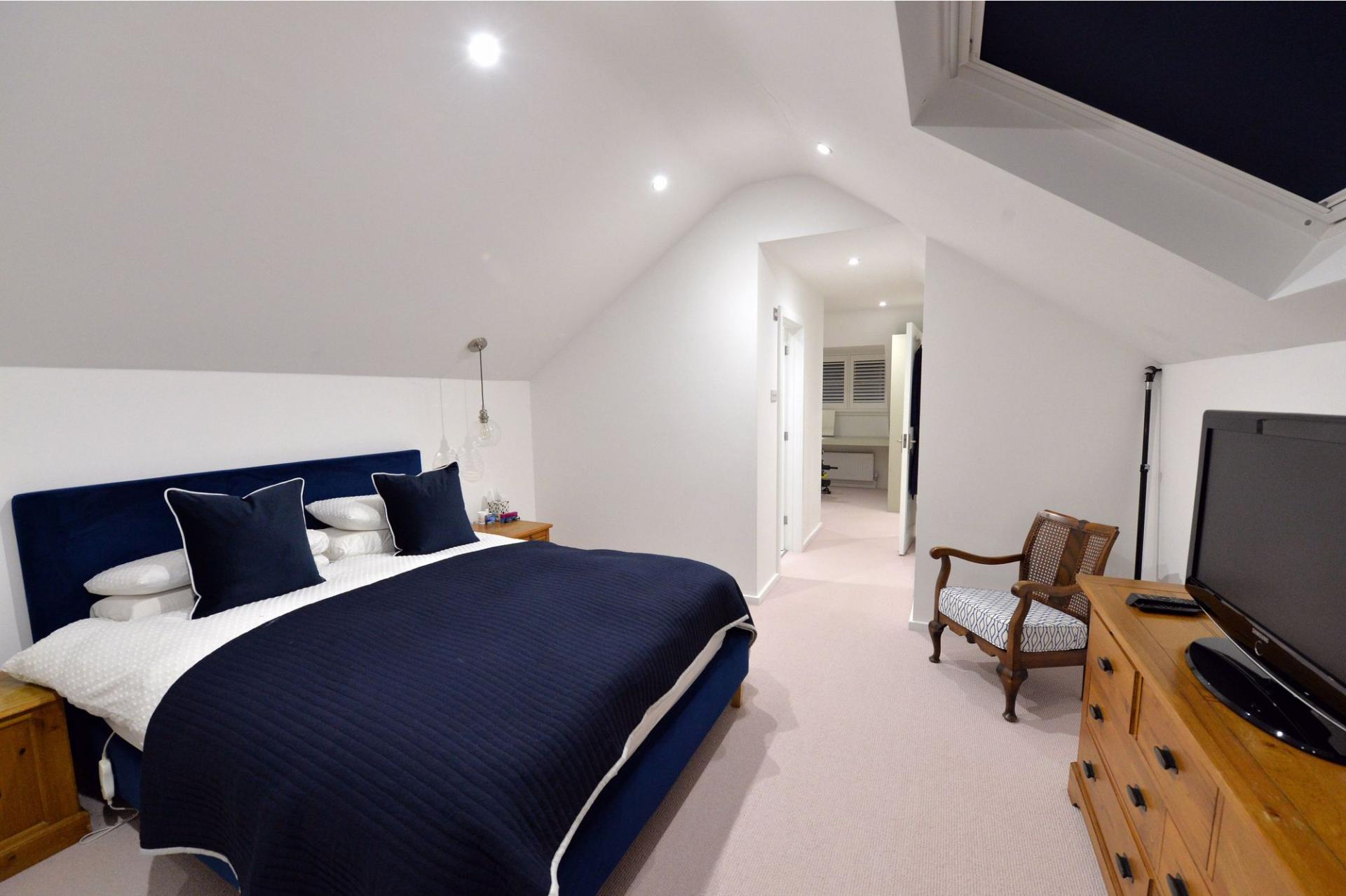 The main bedroom sits above the living room below and is also divided into three areas. The bedroom overlooks the front garden with French doors and a Juliet balcony. A Velux skylight provides additional light and ventilation. The ensuite shower room is in the centre of the room and the opposite end is the dressing area, fitted with a range of pale grey wardrobes and a dressing table.