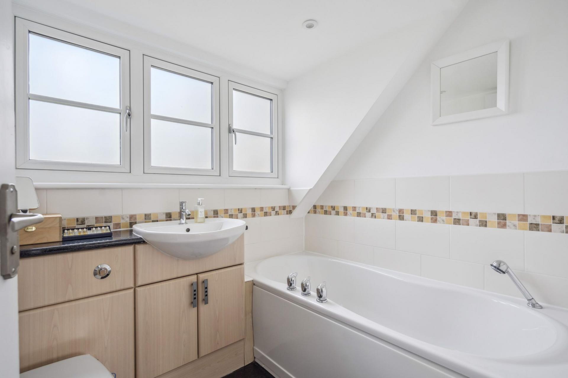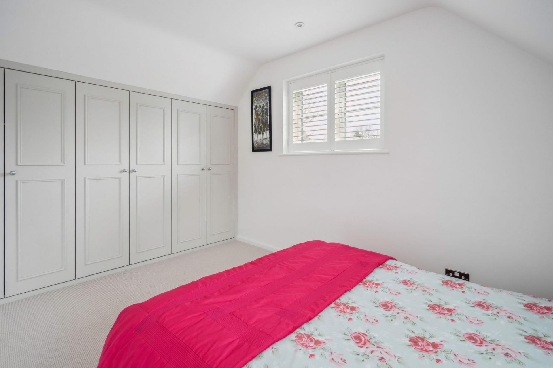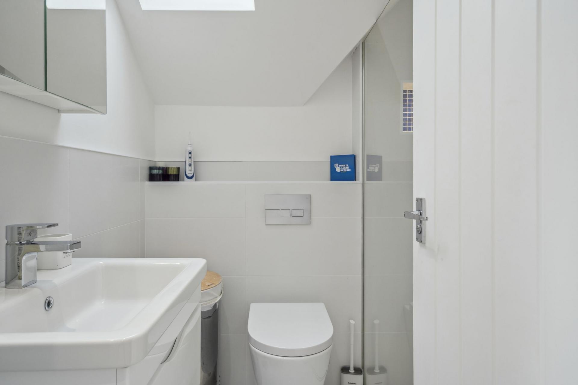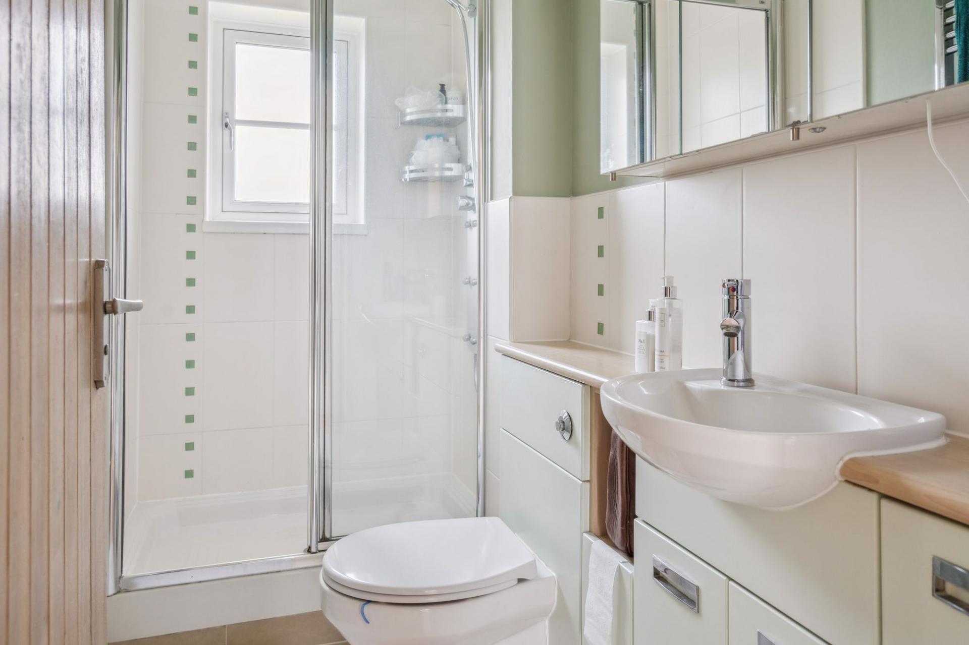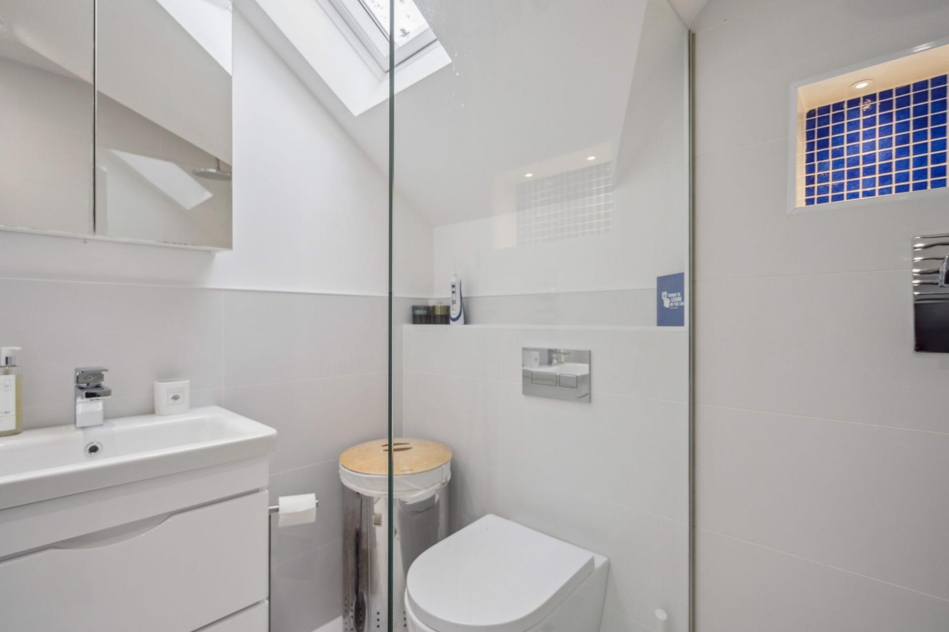 The main bedroom sits above the living room below and is also divided into three areas. The bedroom overlooks the front garden with French doors and a Juliet balcony. A Velux skylight provides additional light and ventilation. The ensuite shower room is in the centre of the room and the opposite end is the dressing area, fitted with a range of pale grey wardrobes and a dressing table.