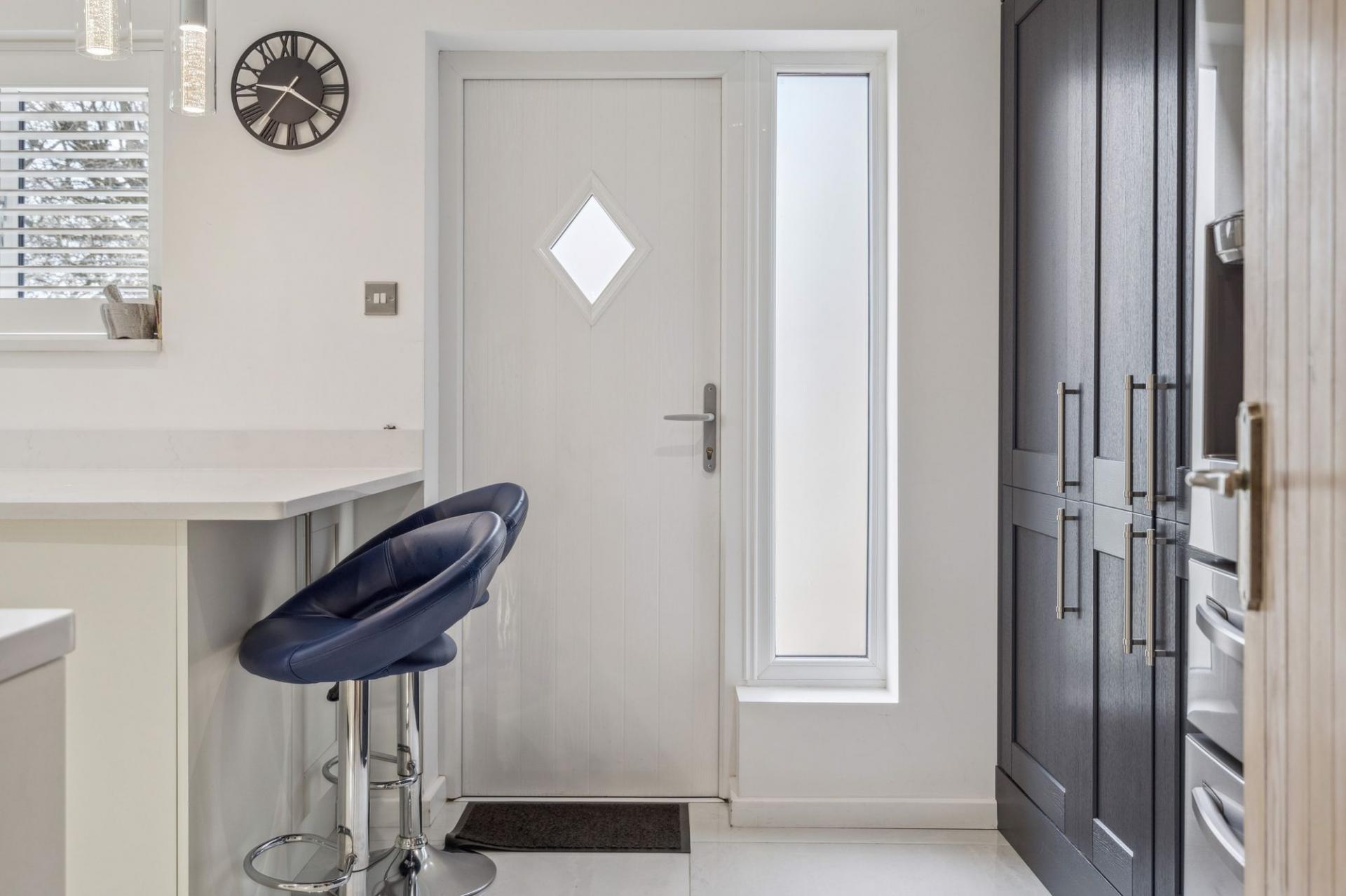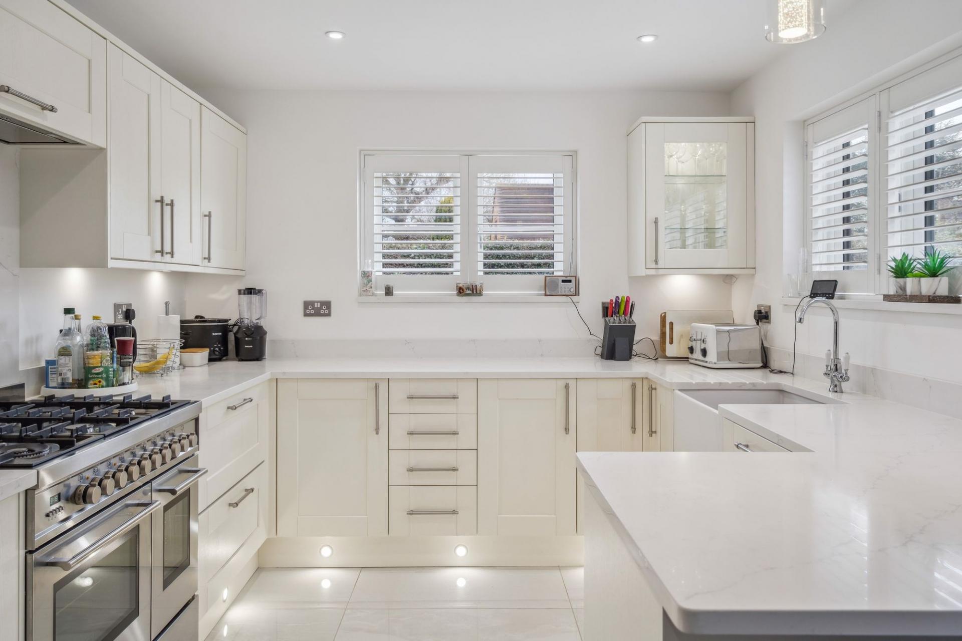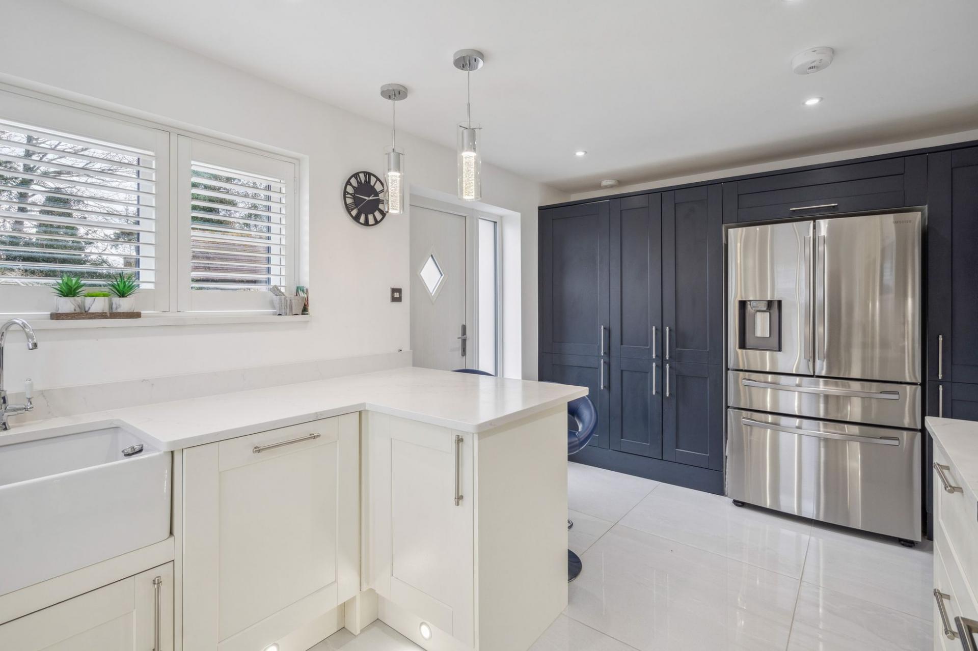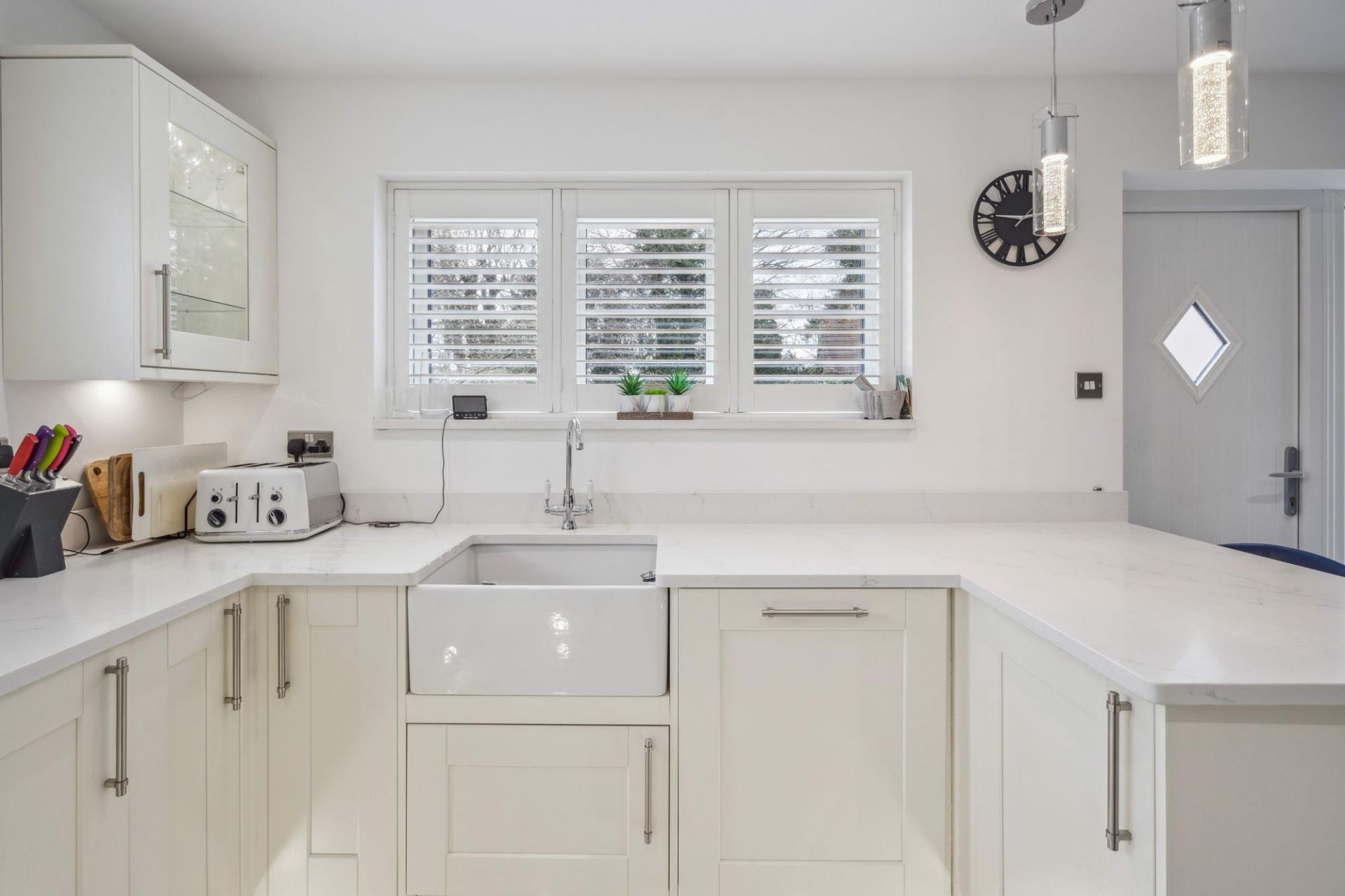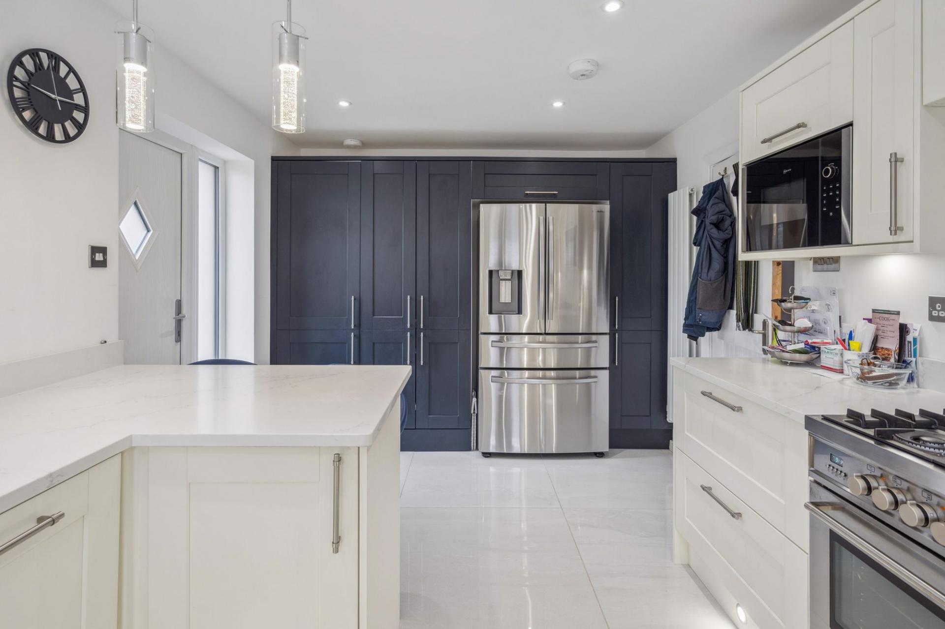The double aspect kitchen is on the left and divides into cooking and utility areas. The cooking area has been refitted with a range of cream satin units with white quartz worksurface, butler sink, integrated dishwasher, integrated microwave and 6 burner, combi Britannia range cooker. The end of the kitchen is a utility area which is fitted with large, floor to ceiling, navy units containing the plumbing for a washing machine, the boiler and general storage. A door leads out onto the front garden.