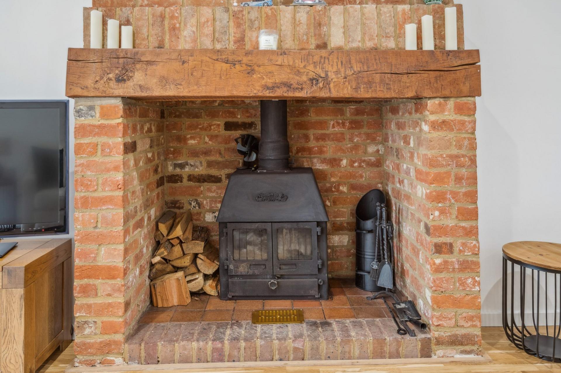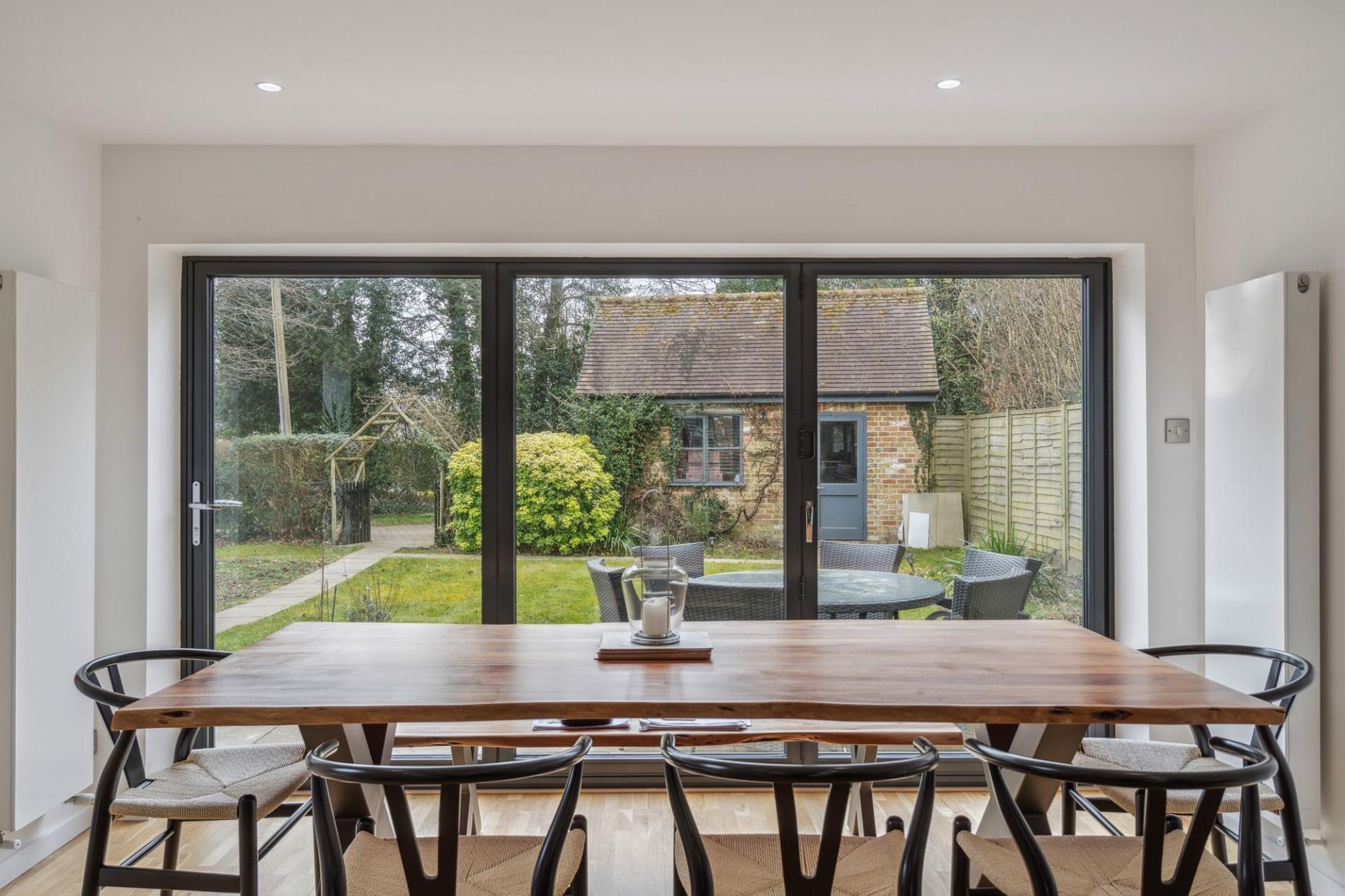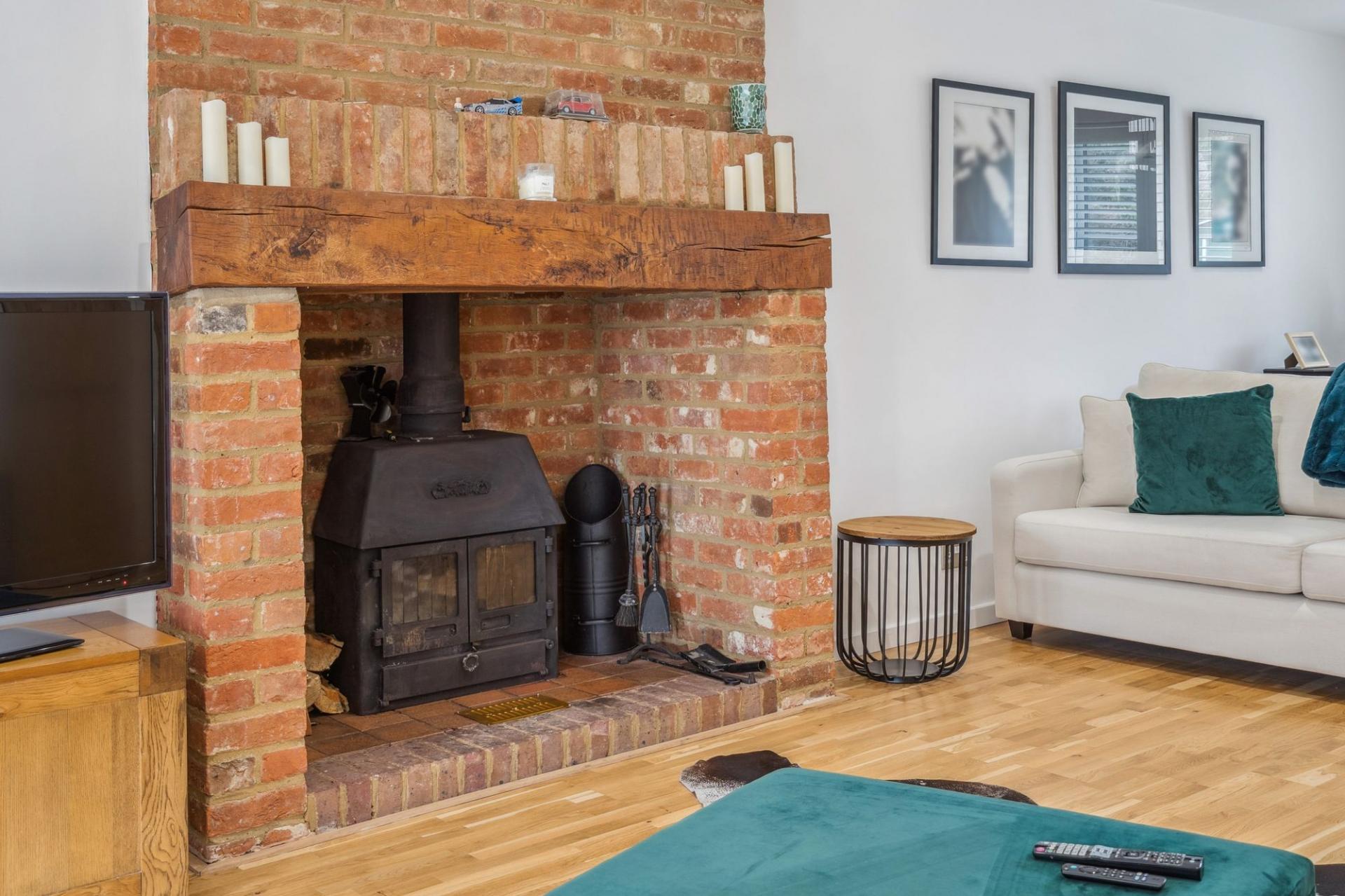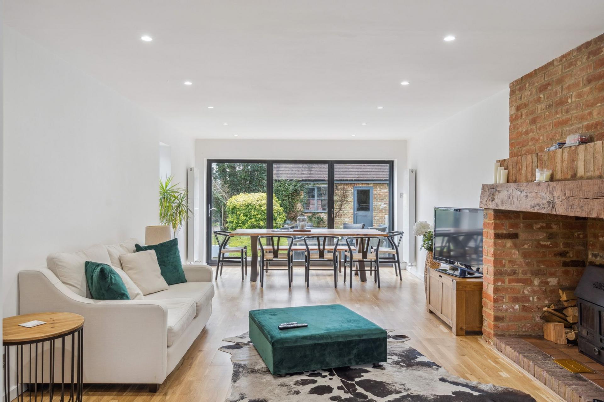 The property has been extended double storey with the living/dining room taking in the whole of the extended area. There is a feature, brick inglenook fireplace with log burner which divides the room into three zones. The dining table is currently next to the bifold doors leading to the front garden, the seating area is around the fireplace and the opposite end is set up as an informal study area.