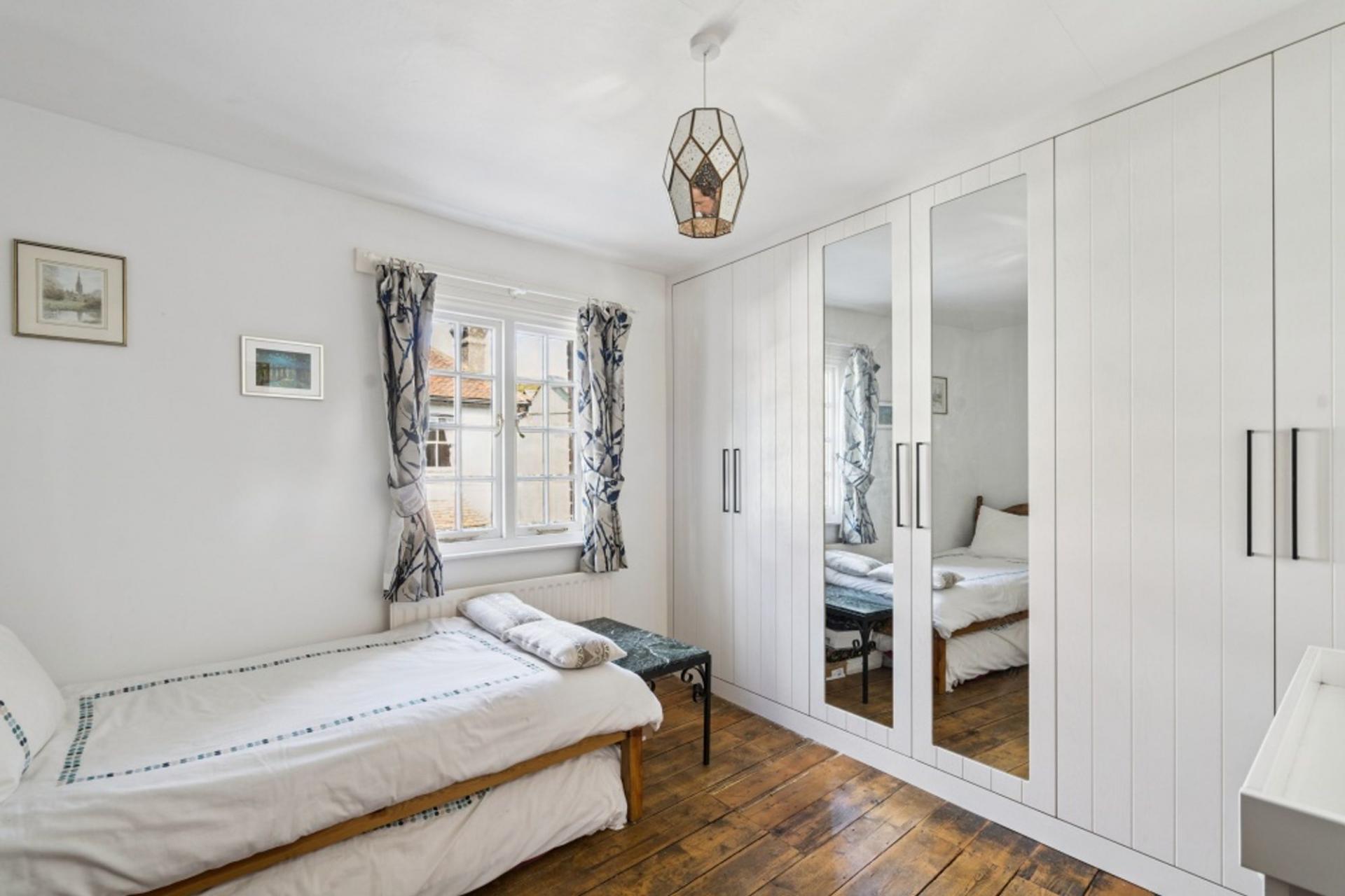A further flight of stairs lead up to the attic bedroom which runs front-to-back across the house. Ther is a useful wash basin and pair of French doors with a Juliet balcony overlooking the garden. There is ample eaves storage and access to a small loft with loft ladder.