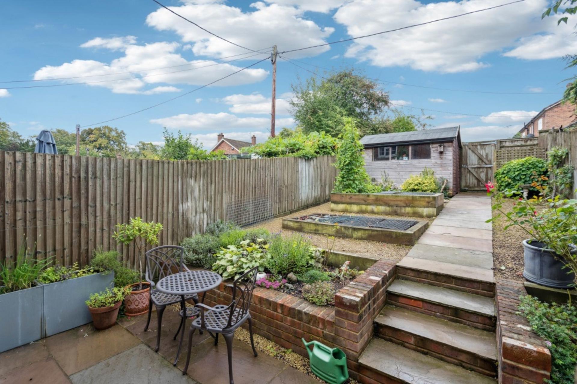To the rear is a pretty South facing landscaped garden. Designed to be easily maintained, there is an initial patio area to enjoy sunny days and evenings, perfect for outside dining. The rest of the garden provides raised areas for planting, with a path leading to a garden shed and walkway behind.