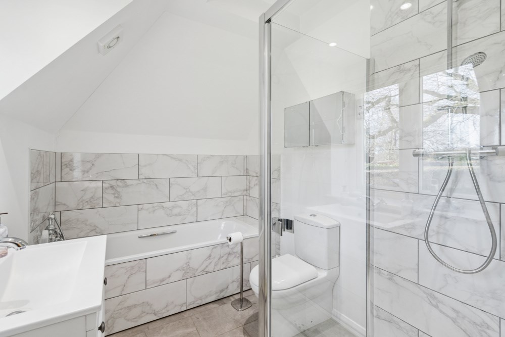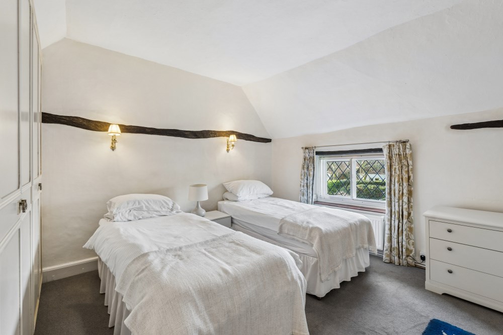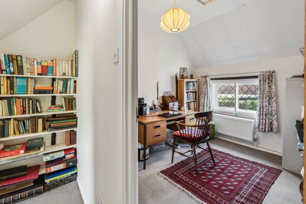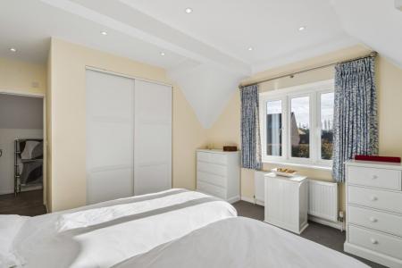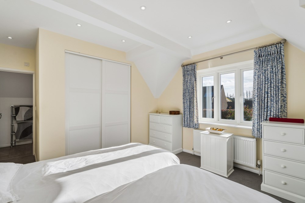 Upstairs, a striking church-style feature window floods the staircase and landing with light. Bedroom two overlooks the front garden and benefits from two double built-in wardrobes. Bedroom three houses the loft hatch, while bedroom four is a generous double room with beamed walls, two fitted wardrobes and views over the garden. The dual-aspect principal bedroom offers a double wardrobe and a private ensuite bathroom fitted with bath, separate shower and wash hand basin with storage beneath.