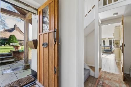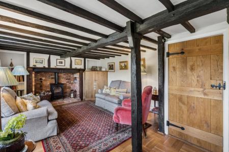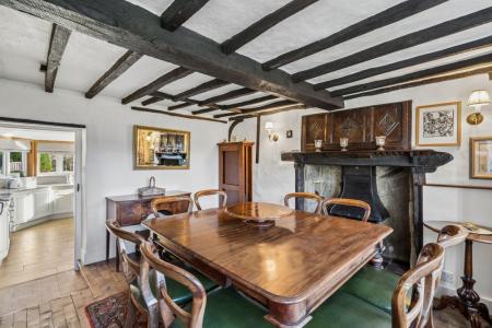 Straight ahead, a glazed wooden door opens into a stunning lounge flooded with natural light. This inviting space boasts exposed beams, engineered wood flooring and a feature log burner, creating a warm and cosy atmosphere. A further door leads through to the dining room, where parquet flooring, wooden beams and an open fireplace provide a charming setting for entertaining.