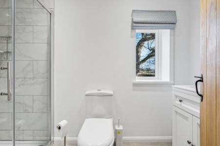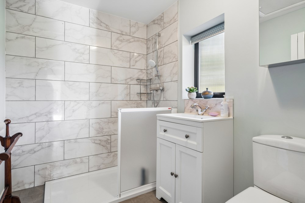 Approached via a gravel driveway providing ample parking for several vehicles, the property is entered to the rear through a wooden gate with a storm porch overhead. The welcoming entrance hallway immediately sets the tone, featuring a useful cupboard beneath the stairs. To the right is a stylish downstairs shower room, fitted with a walk-in shower and handheld attachment.