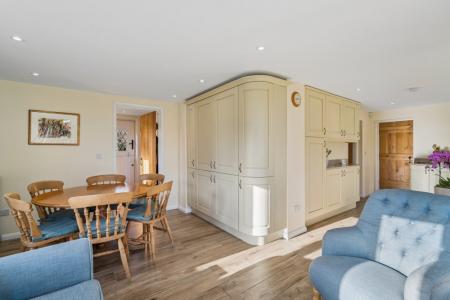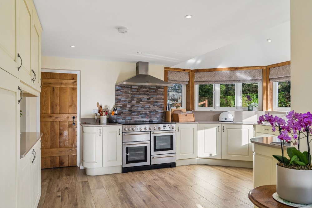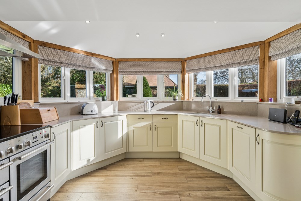 The dining room flows seamlessly into the impressive open-plan kitchen diner. The kitchen itself is uniquely designed with a part-hexagonal layout and fitted in an immaculate country style. It features integrated appliances including a dishwasher, two fridges and a freezer, alongside an electric oven and a 110-size Rangemaster. Marble work surfaces complete this elegant and practical space. The kitchen opens into a bright dining area with patio doors leading directly onto the garden, while dual-aspect windows ensure the entire space is bathed in natural light.