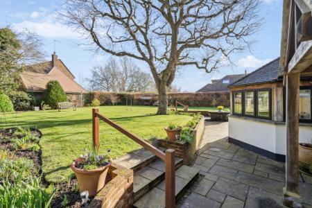 Externally, the property continues to impress. A detached double garage with light and power provides excellent storage or workshop potential. The rear garden is truly picturesque, centred around a magnificent oak tree and bordered by mature hedging and laurel trees for privacy. The grounds feature raised beds, a greenhouse, a sandpit and a wonderful lawned area, along with extensive patio space ideal for al fresco dining and outdoor entertaining.