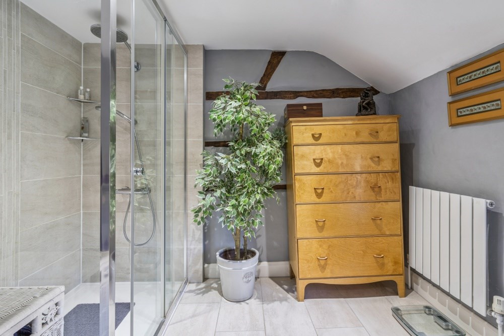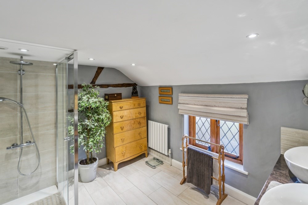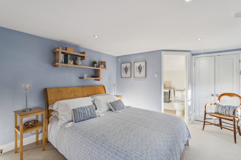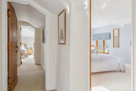 The upstairs is equally beautifully presented and decorated with four bedrooms and two bathrooms. The principal bedroom offers excellent wardrobe storage along with eaves storage and a contemporary en suite with a large walk in shower and double sinks. A further double bedroom overlooks the front of the property with an en suite bathroom and wardrobe storage. The third bedroom is also a spacious double room with the fourth bedroom with fitted wardrobes is easily adaptable to being a single bedroom, nursery, dressing room or second office space.