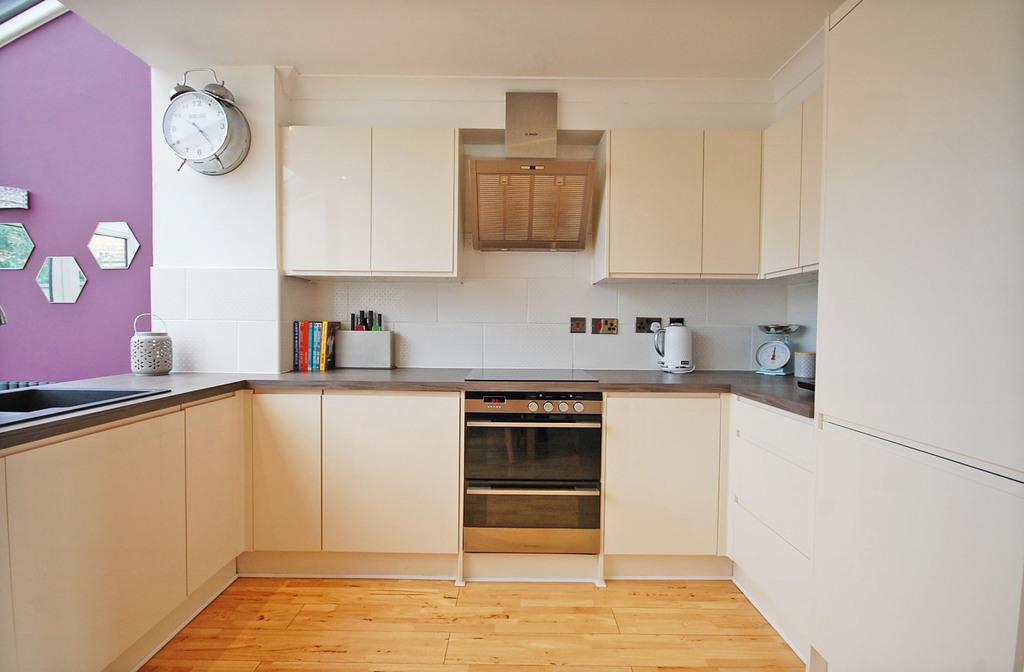Matching wall and base units with edged work surfaces and tiled splashbacks, bowl sink and drainer with central mixer taps, built-in double oven, induction hob and extractor hood, integrated fridge/freezer, dishwasher and washing machine, solid wood flooring, smooth ceiling.