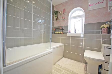 Double glazed opaque window to rear aspect, partly tiled walls, P-shaped bath with shower attachment and rainfall shower head, inset wash hand basin, inset WC, heated towel rail, tiled flooring, smooth ceiling.