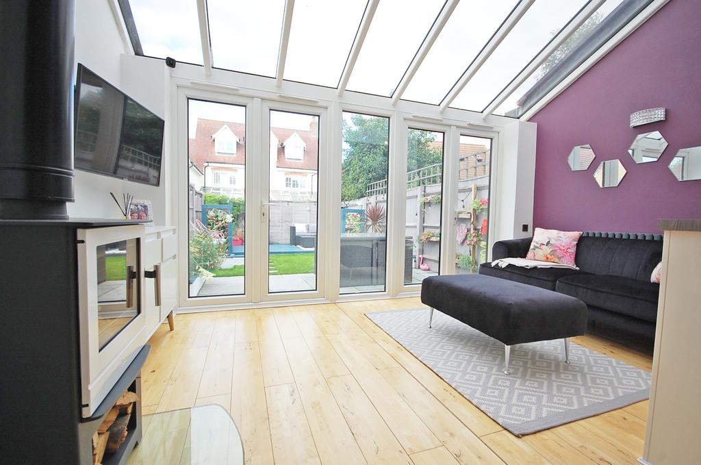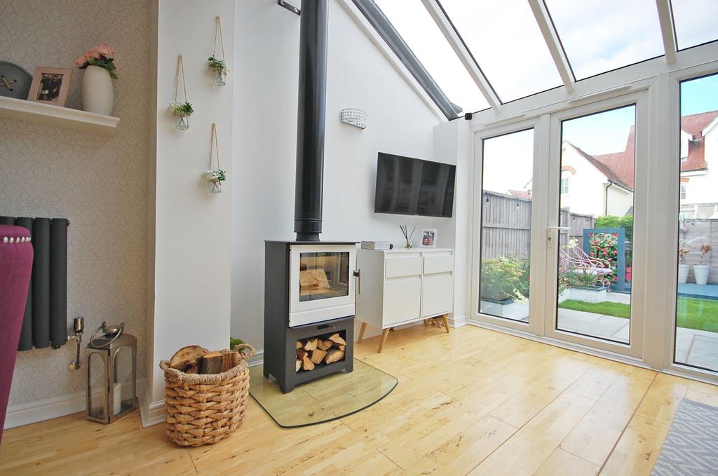 Double glazed french doors to rear garden, radiator, solid wood flooring, log burner.