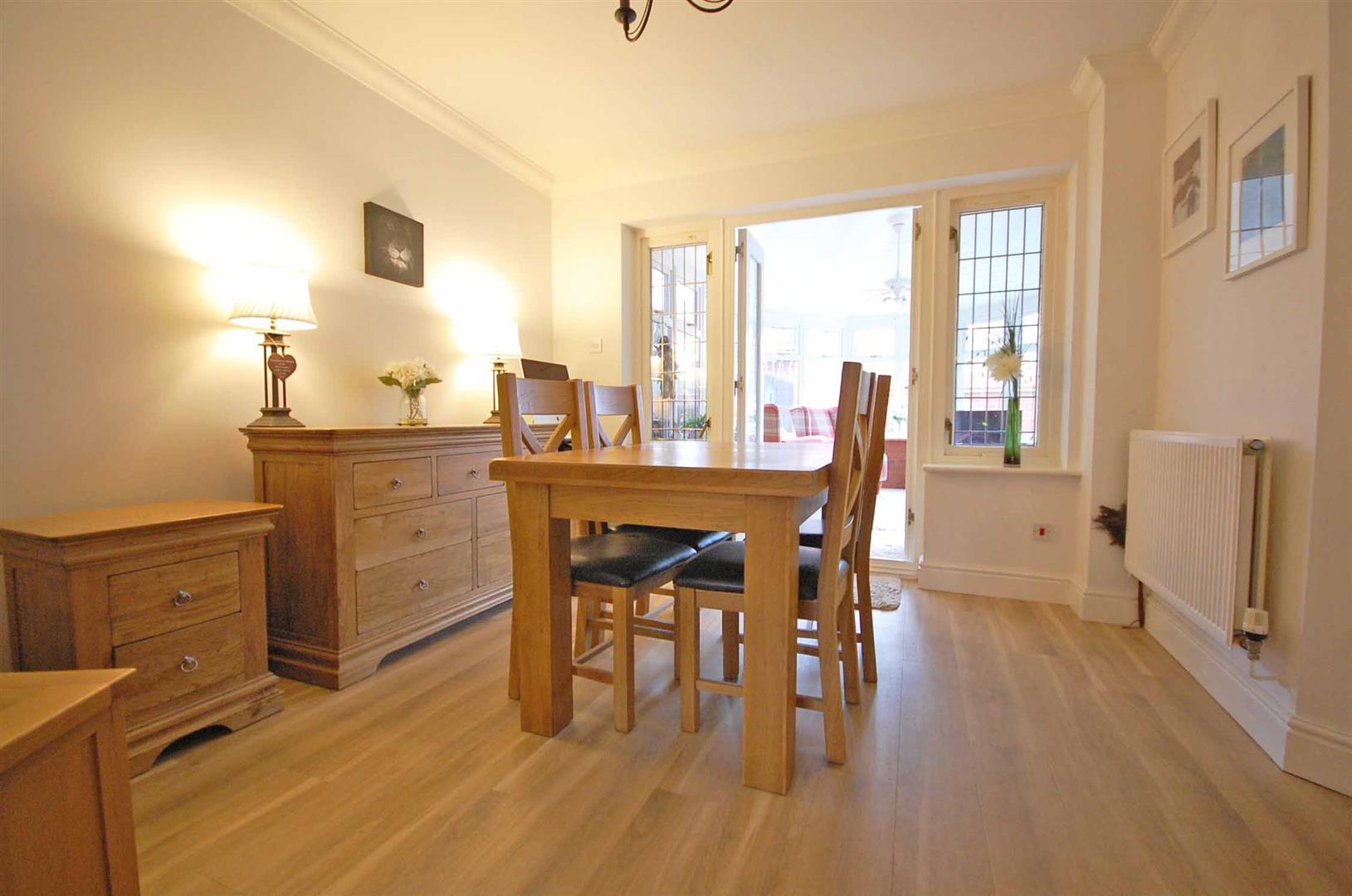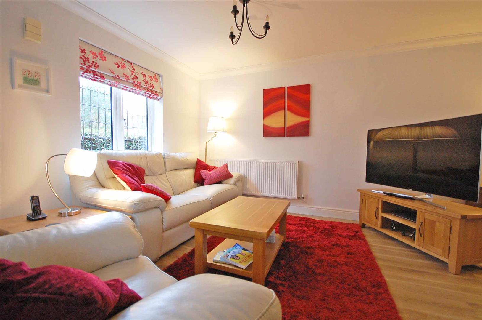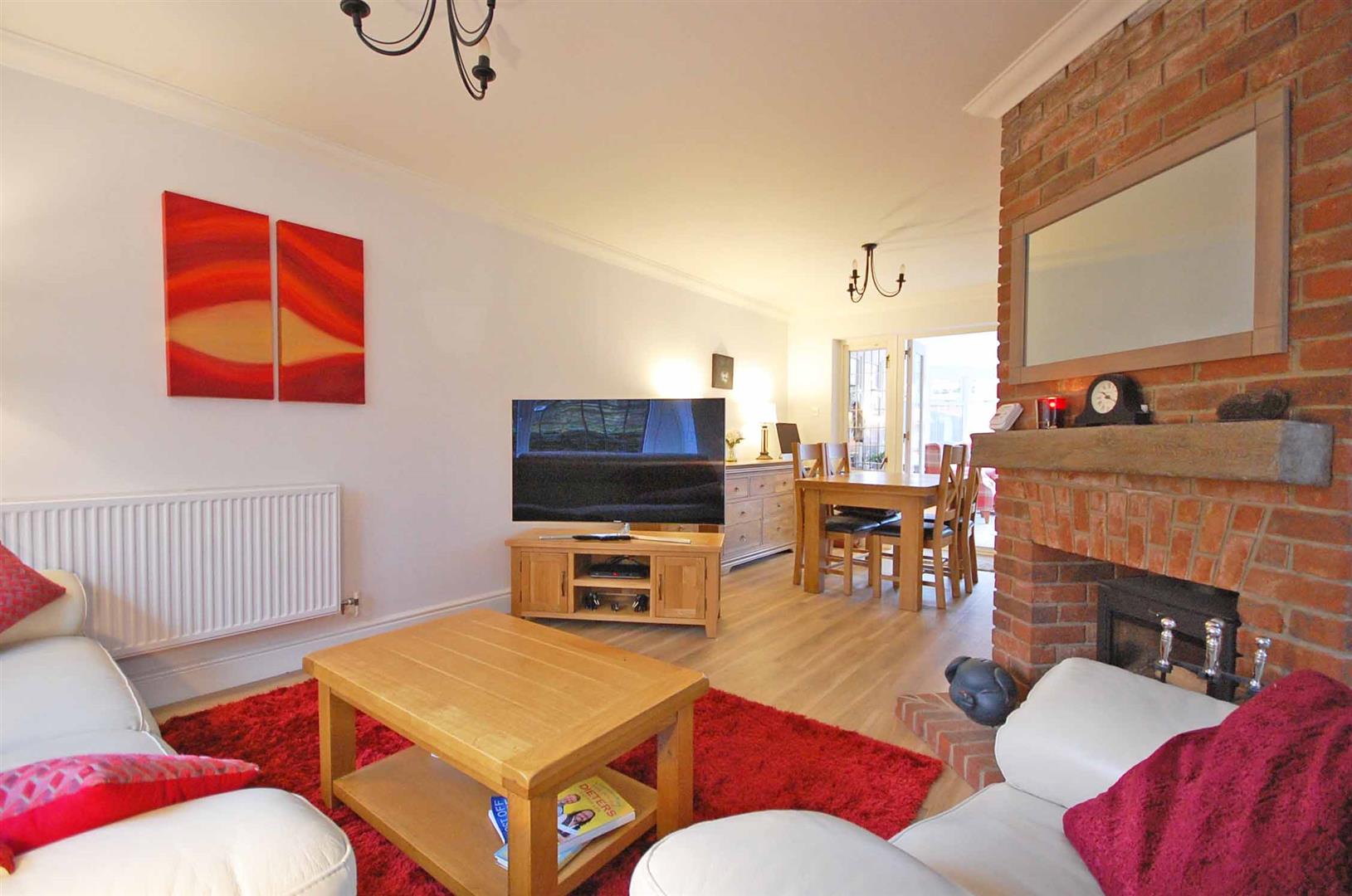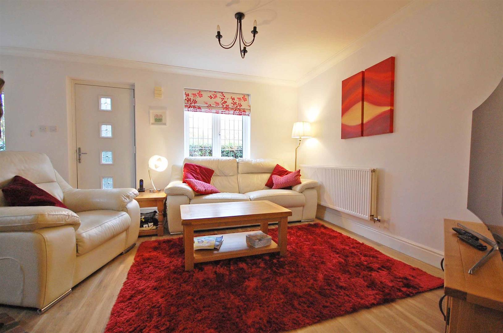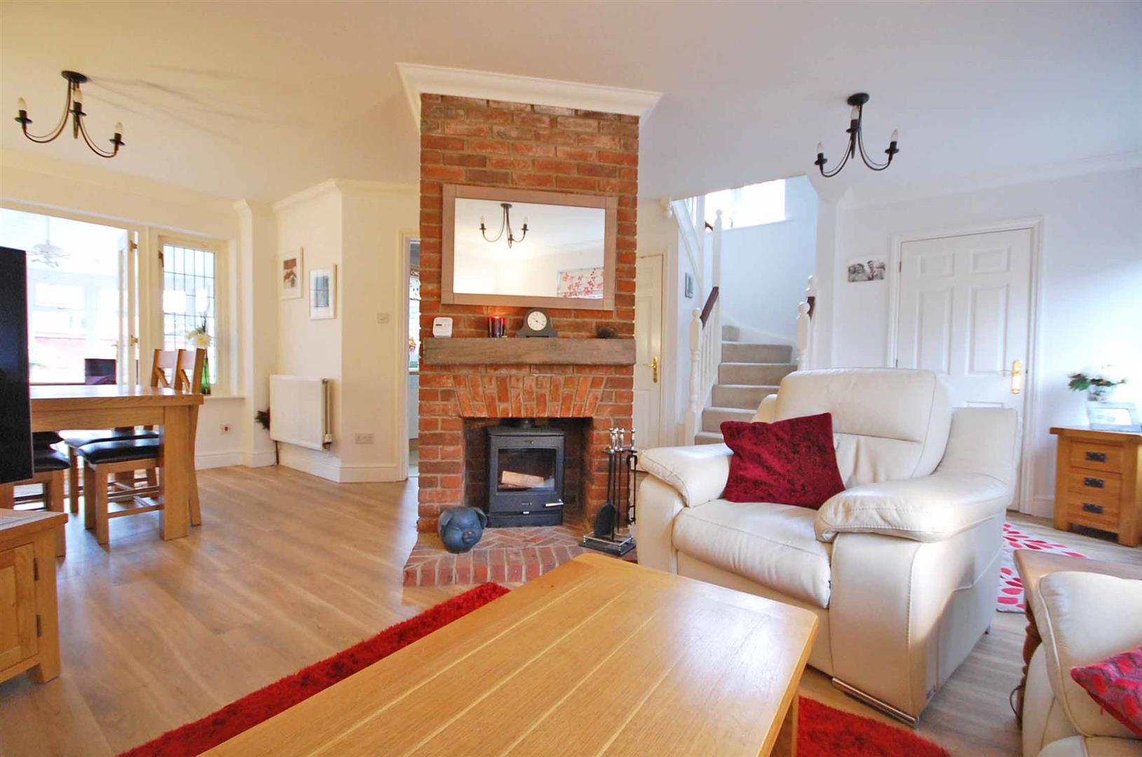 Double glazed window to front aspect, lead lined window to rear aspect, stairs to first floor, feature fireplace surround with log burner (by negotiation), radiator, Amtico flooring, smooth ceiling, double glazed lead lined french doors to conservatory.