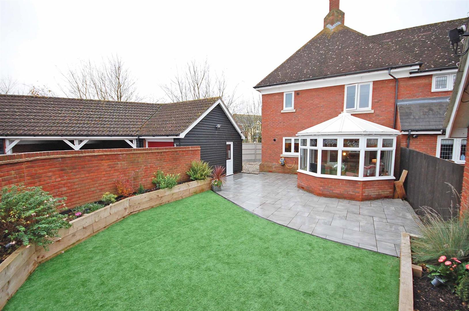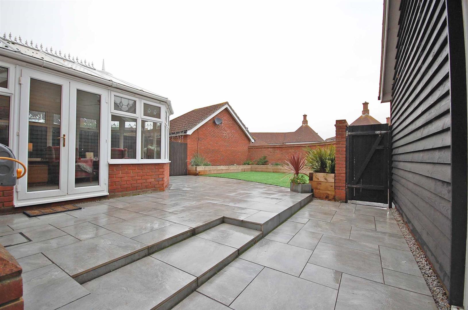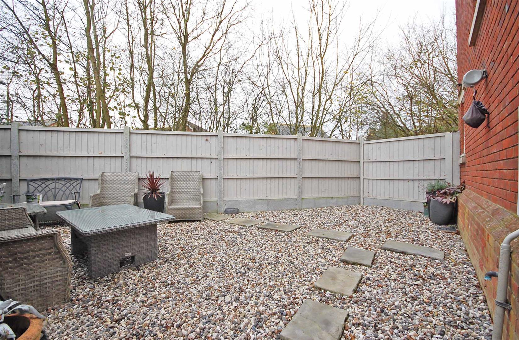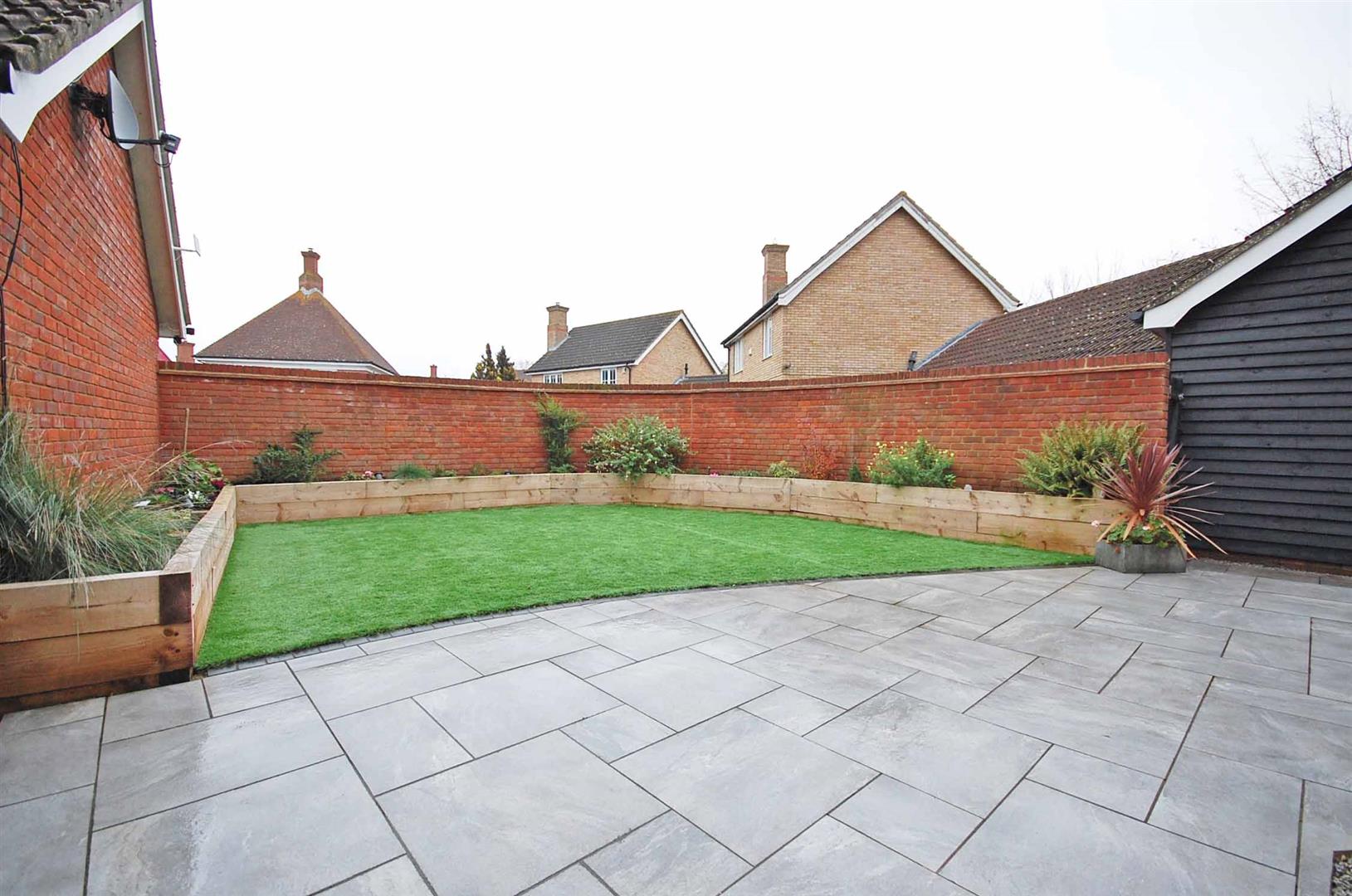 Enclosed rear garden with hard standing patio area, raised flower beds, artificial lawn area, access to rear parking via a gate, side access to garage.