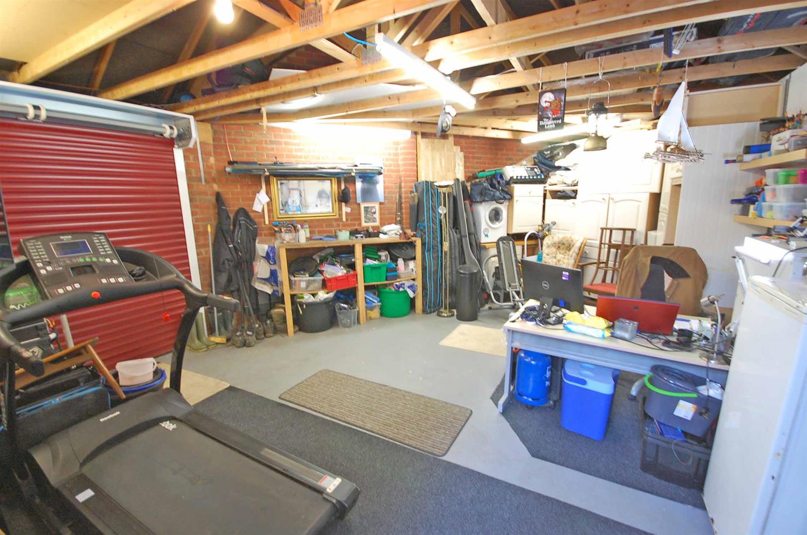 Detached double width garage with single electric roller door, light and power, carport and parking area.