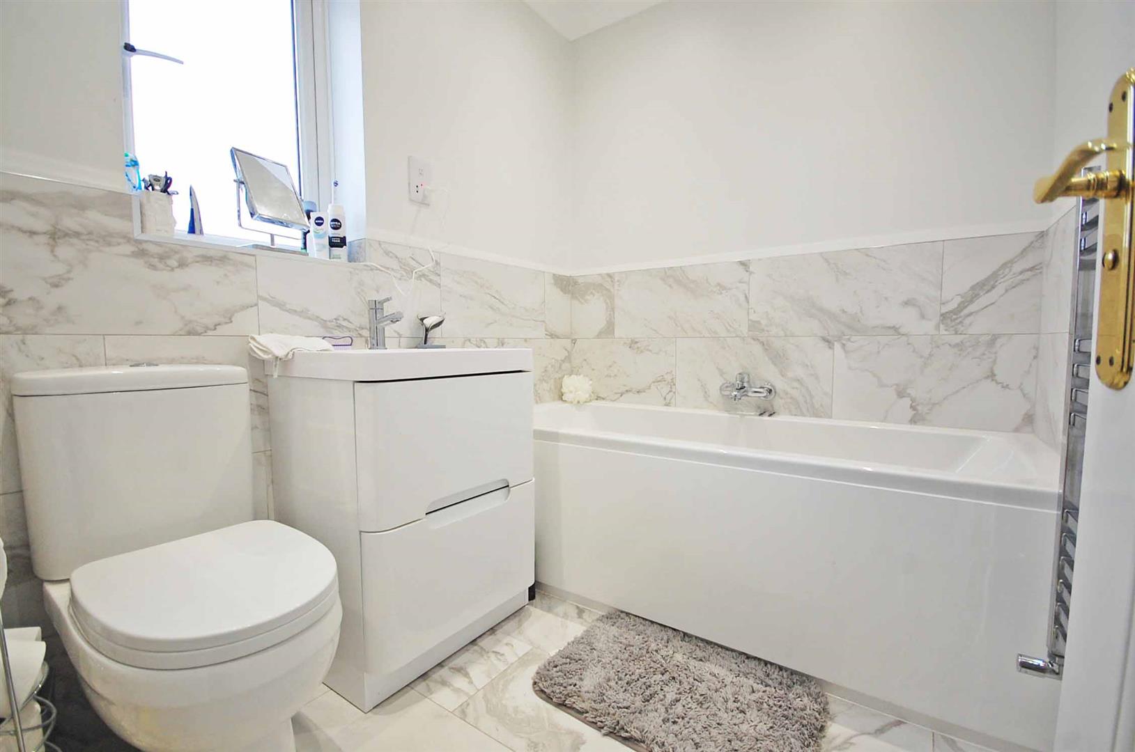 Double glazed opaque window to rear aspect, fully tiled walls, panelled bath with central mixer taps, low level WC, pedestal wash hand basin, heated towel rail, tiled flooring, smooth ceiling.