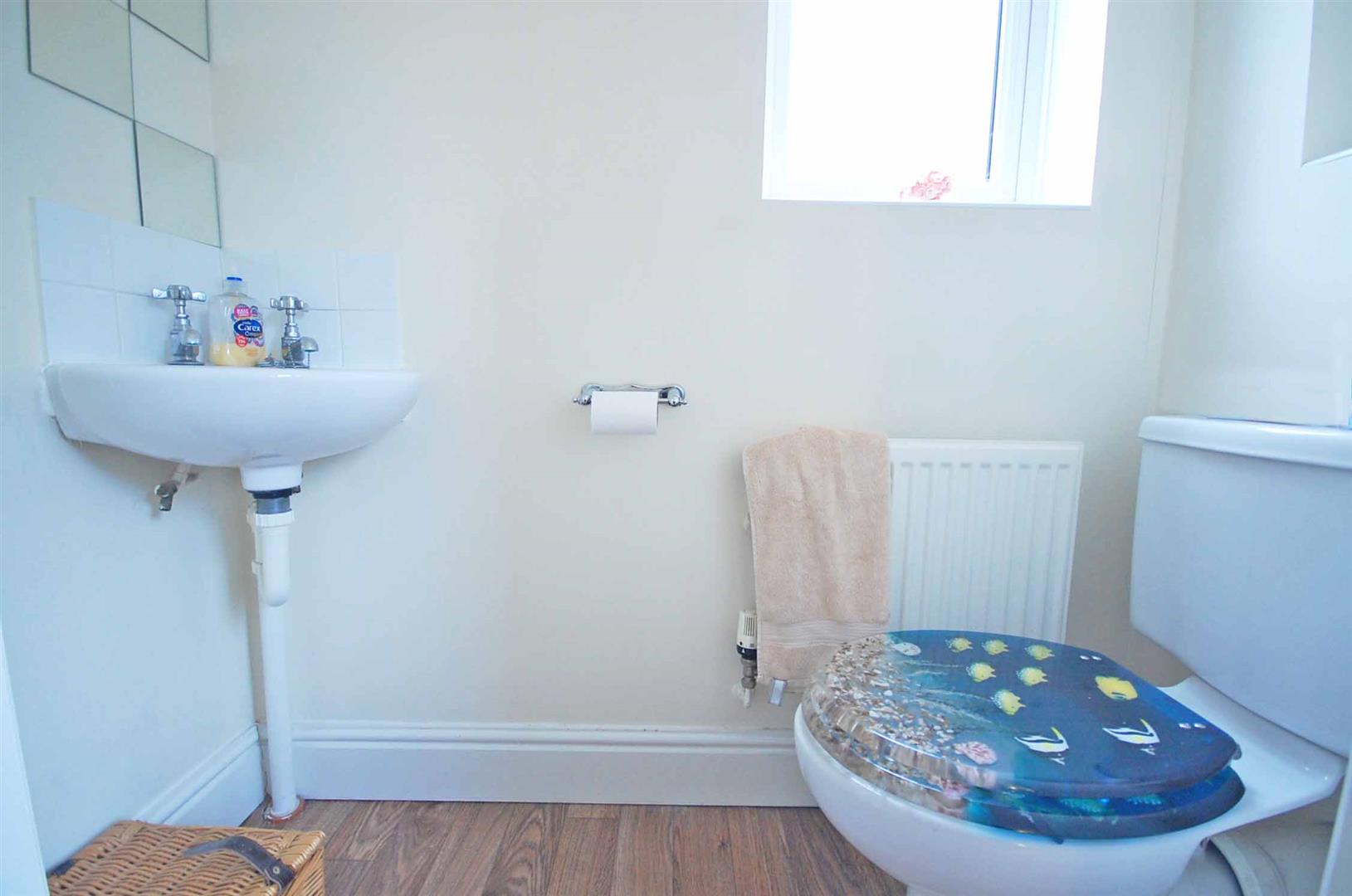 Double glazed opaque window to side aspect, low level WC, vanity wash hand basin, radiator, vinyl flooring, smooth ceiling.