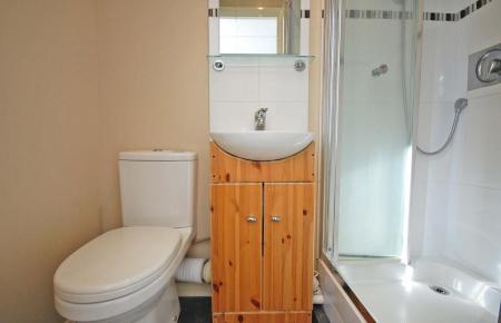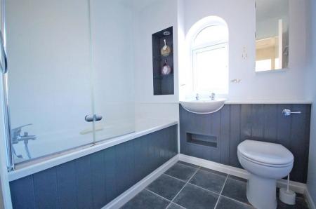 Double glazed opaque window to rear aspect, partly tiled walls, panelled bath with shower over, inset WC, inset wash hand basin, radiator, vinyl flooring, textured ceiling.