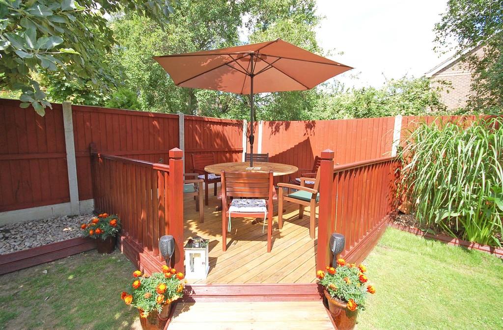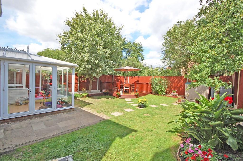 Enclosed rear garden with side access, hard standing patio area, raised decked area, mainly laid to lawn with mature borders.