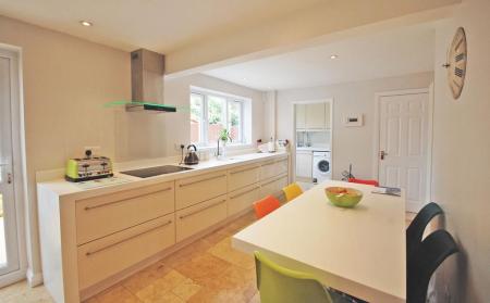 Double glazed window to rear aspect, matching wall and base units with edged work surfaces, one and a half bowl sink with central mixer taps, two built-in ovens, electric hob with extractor over, integrated fridge/freezer, radiator, tiled flooring, smooth ceiling. Doors to conservatory, utility room & cloakroom.
