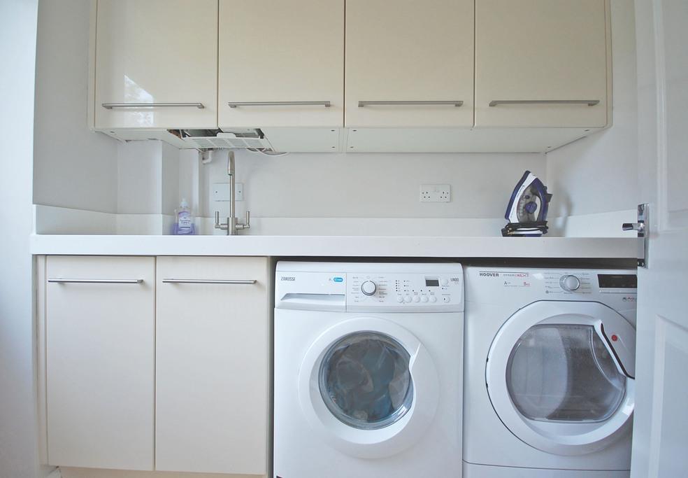 Matching wall and base units with edged work surfaces, bowl sink with central mixer taps, space for washing machine and tumble dryer, boiler housed in cupboard, radiator, tiled flooring, smooth ceiling. Door to rear garden.