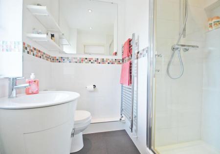 Double glazed opaque window to rear aspect, enclosed shower unit, partly tiled walls, low level WC, pedestal wash hand basin, heated towel rail, tiled flooring, smooth ceiling.