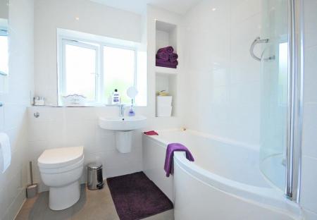 Double glazed opaque window to rear aspect, P-shaped panelled bath, inset WC, inset wash hand basin, heated towel rail, tiled flooring, smooth ceiling.