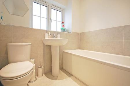 Opaquer double glazed window to front aspect, panelled bath with central mixer tap and shower attachment, low level WC, pedestal wash hand basin, shaver point, extractor fan, heated towel rail, tiled flooring and smooth ceiling with sunken spotlights.