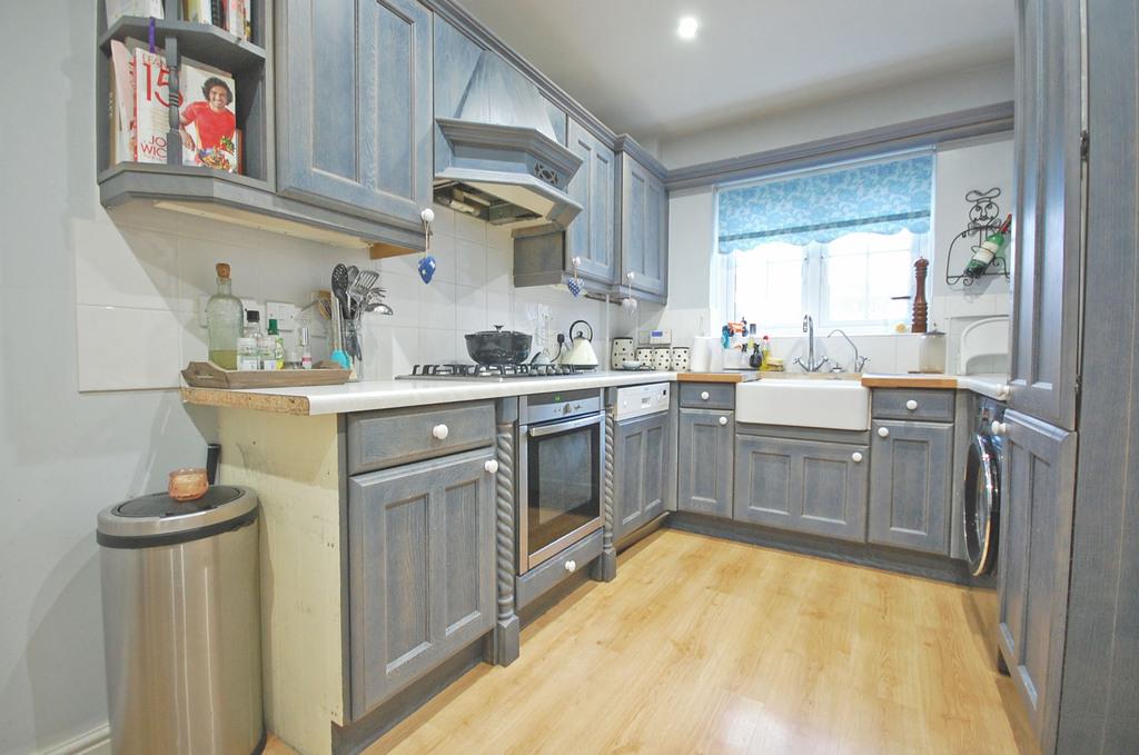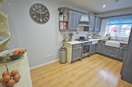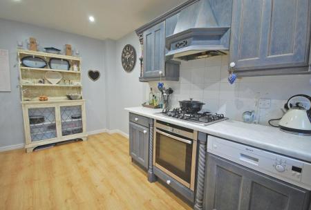 Double glazed window to front aspect, a series of matching base and wall units, butler sink with solid wood drainer and central mixer tap, built-in single oven, five ring gas hob, integrated fridge/freezer, dishwasher and space for washing machine, radiator, laminate flooring and smooth ceiling with sunken spotlights.