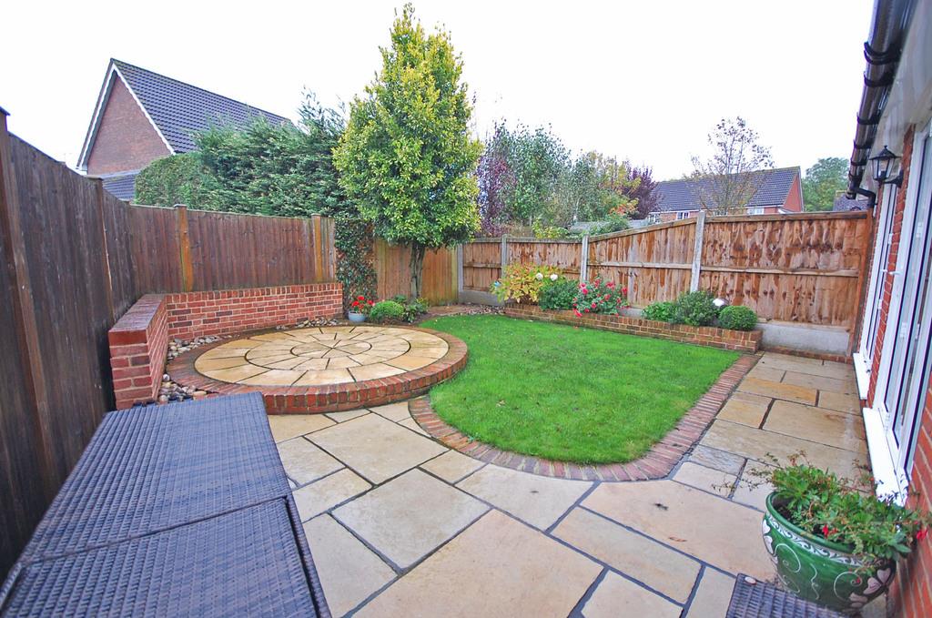 Fenced rear garden, landscaped throughout with patio area to immediate rear and raised decorative paved area to rear, remainder mostly laid to lawn with some decorative stone areas and shrubs/flowers set into raised beds.