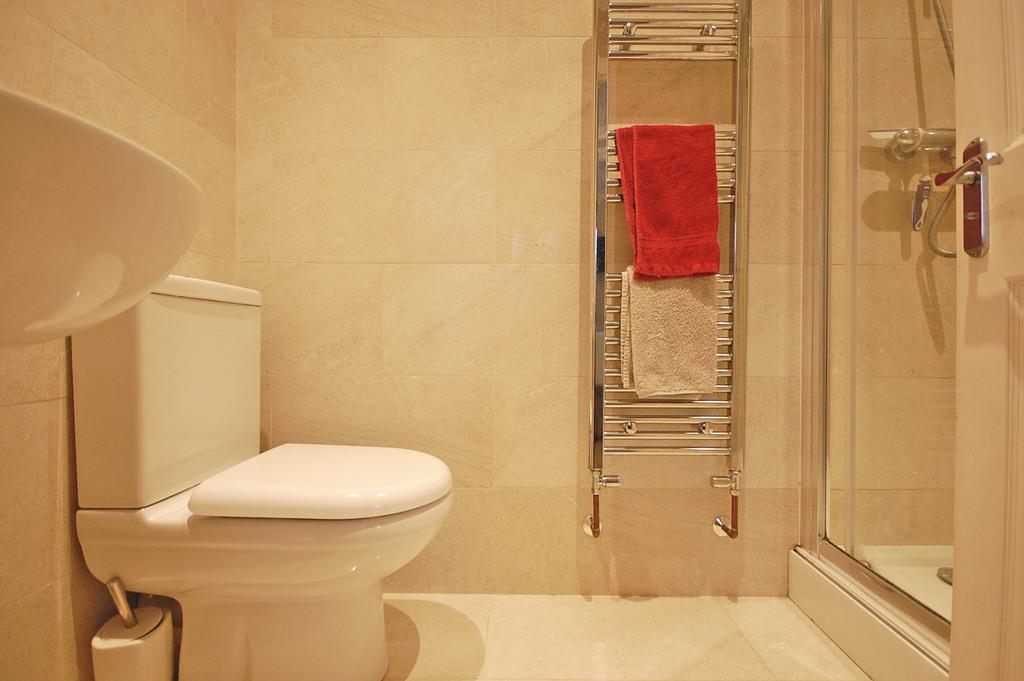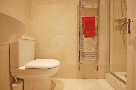 Fully tiled double shower, low level WC, pedestal wash hand basin, extractor fan, heated towel rail, tiled flooring and smooth ceiling with sunken spotlights.