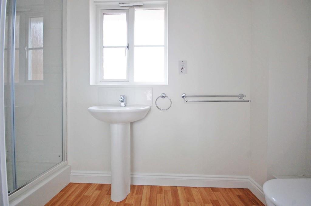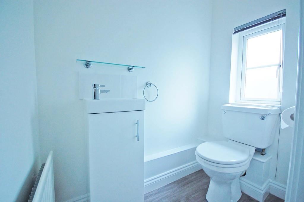 Double glazed opaque window to front aspect, low level WC. pedestal wash hand basin, radiator, laminate wood flooring, smooth ceiling.