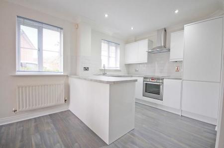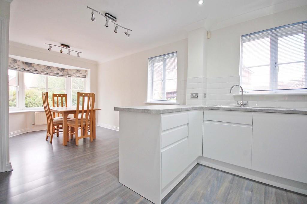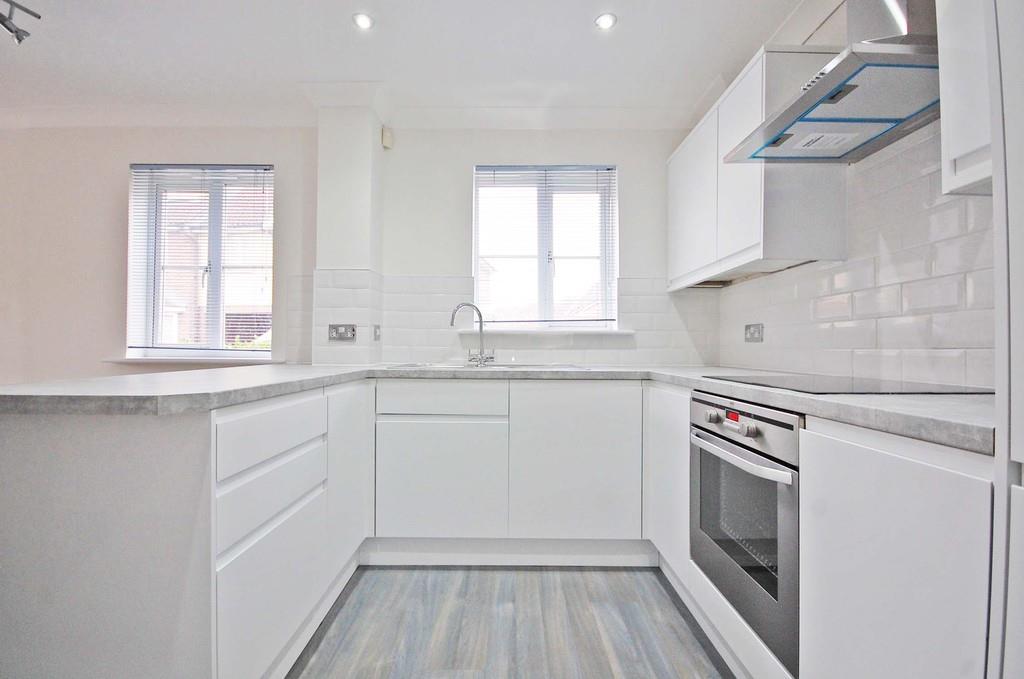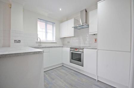 Double glazed windows to side and bay window to front aspect, matching wall and base units with edged work surfaces, one and a half bowl sink and drainer with central mixer taps, built-in oven, electric hob, extractor hood, space for fridge/freezer, wall-mounted boiler in cupboard, radiator, laminate wood flooring, understairs storage cupboard, smooth ceiling.