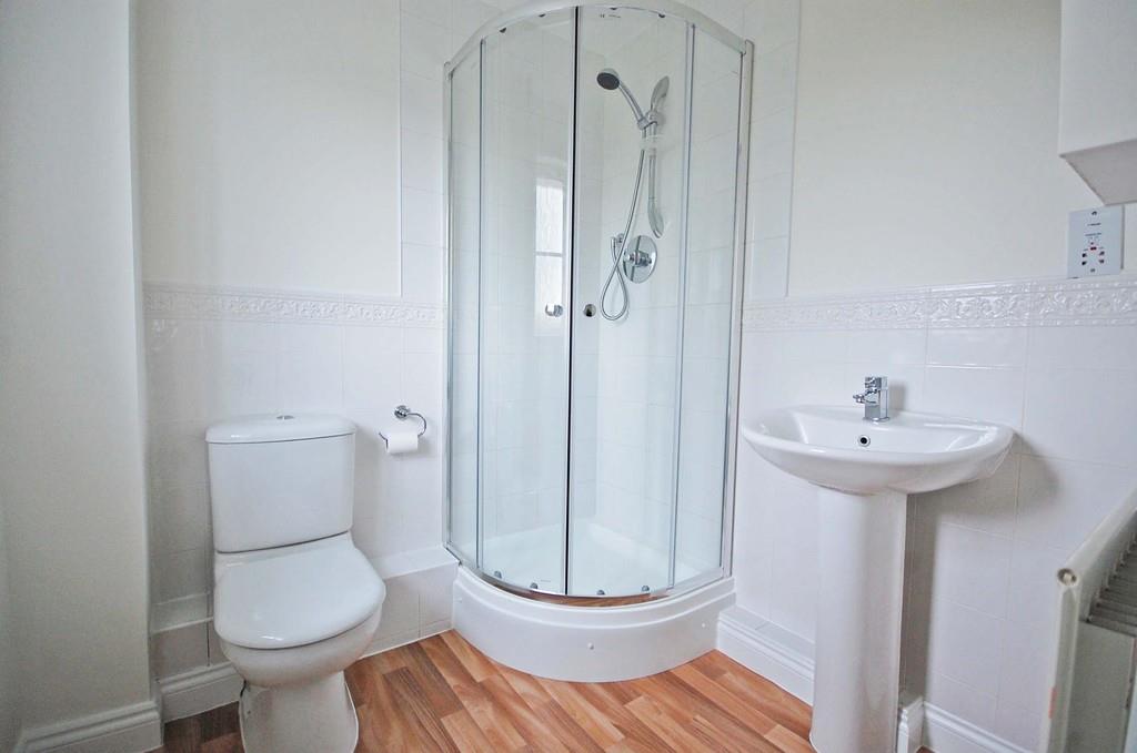 Double glazed opaque window to front aspect, enclosed shower unit, partly tiled walls, low level WC, pedestal wash hand basin, radiator, vinyl flooring, smooth ceiling.