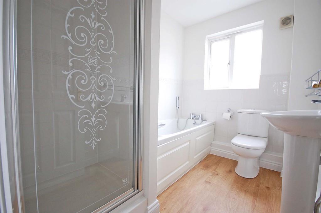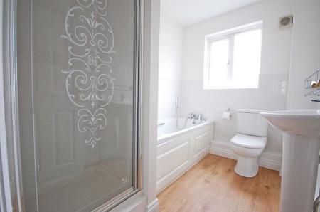 Double glazed opaque window to side aspect, enclosed shower unit, partly tiled walls, panelled bath with shower attachment, low level WC, pedestal wash hand basin, radiator, vinyl flooring, smooth ceiling.