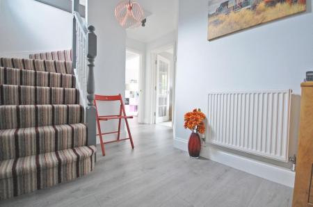 Stairs to first floor, radiator, understairs storage, laminate wood flooring, smooth and coved ceiling.