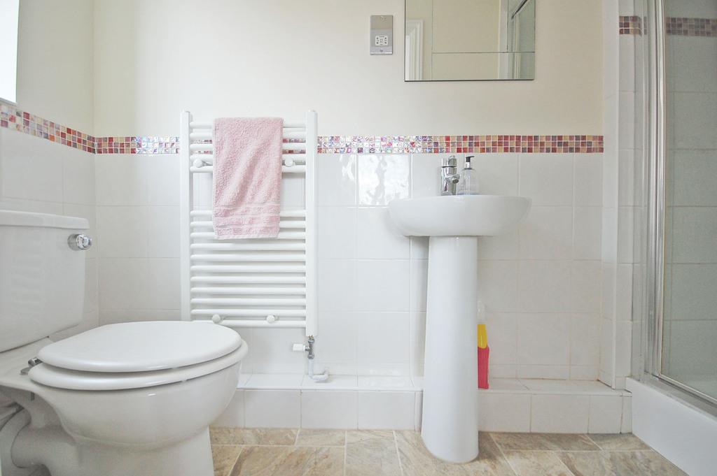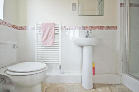 Double glazed opaque window to side aspect, enclosed shower unit, fully tiled walls, low level WC, pedestal wash hand basin, heated towel rail, vinyl flooring, smooth ceiling.
