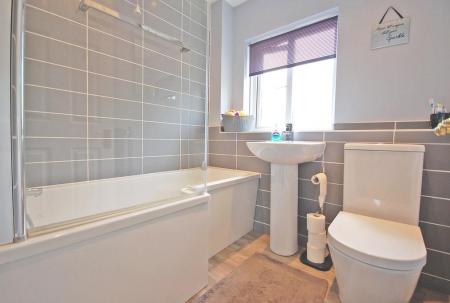 Double glazed opaque window to front aspect, partly tiled walls, P-shaped bath with electric shower over, low level WC, pedestal wash hand basin, heated towel rail, vinyl flooring, smooth ceiling.