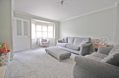 Double glazed bay window to front aspect, fireplace surround, radiator, storage cupboard, carpeted flooring, smooth ceiling.